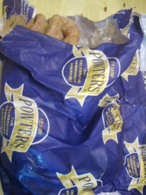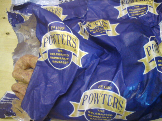 What is a Powter’s sausage? It is made by the firm of Powter’s, a Newmarket business which started in the back end of the nineteenth century. A Powter’s sausage is about four to five inches long and probably about an inch in diameter – note inches, Powter’s is English, not a continental meat product. It is 70% pork, rusk, water, spices, flavourings. The flavourings must be herbs which include sage – but only the tiniest delicious hint of sage. There is plenty of pepper, plenty, and enough salt to bring out the flavour of the pork. The skin is what is delicately called pork casings, but it is probably entrails (sorry squeamish ones and vegetarians)