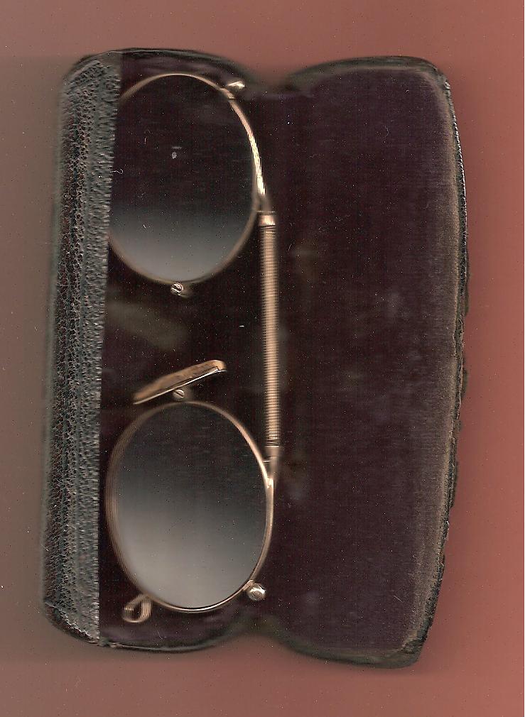 This slightly damaged pair of pince-nez may have had a chain or lorgnette attached to the loop you can see in the bottom right of the lens. This pair has lost one of its nose supports but the other still has its cushion.