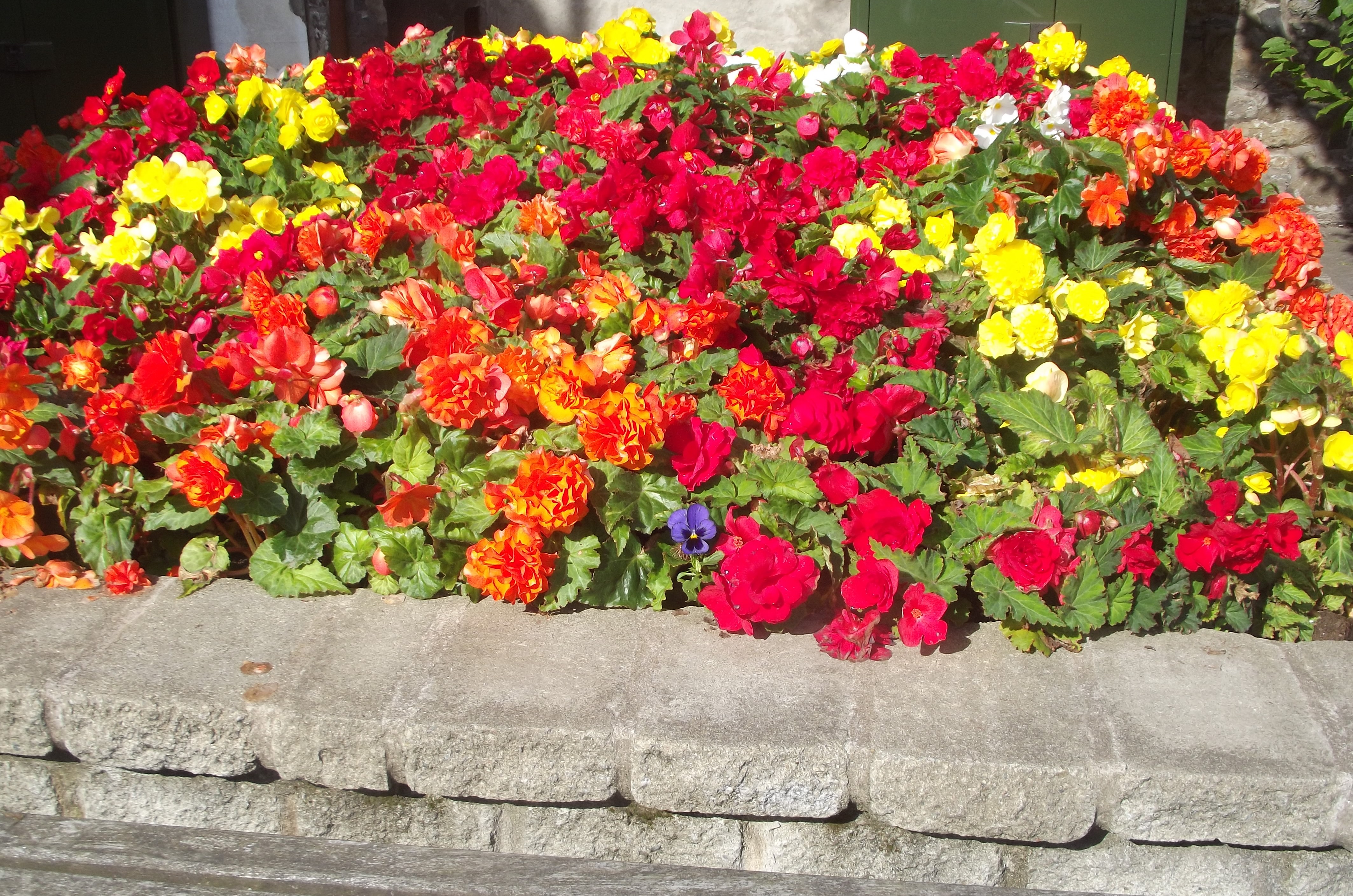 As a child I remember so many comic songs being played on the radio…or wireless as we called it then. I’m sure they were mostly of little real merit and probably not very comical but we loved them. I can’t imagine anything more ghastly now than ‘The Laughing Policeman’ and yet it was on Children’s Favourites almost every weekend. Then here was ‘You’re A Pink Toothbrush’, ‘Does Your Chewing Gum Loose Its’ Flavour On The bedpost overnight?’, ‘My Old Man’s A Dustman’… oh , the list is endless. I was reminded of this when I took this photo in Ireland of a bed of begonias… with one lonely little viola and ‘I’m A Lonely Little Petunia In An Onion Bed’ sprang to mind.