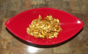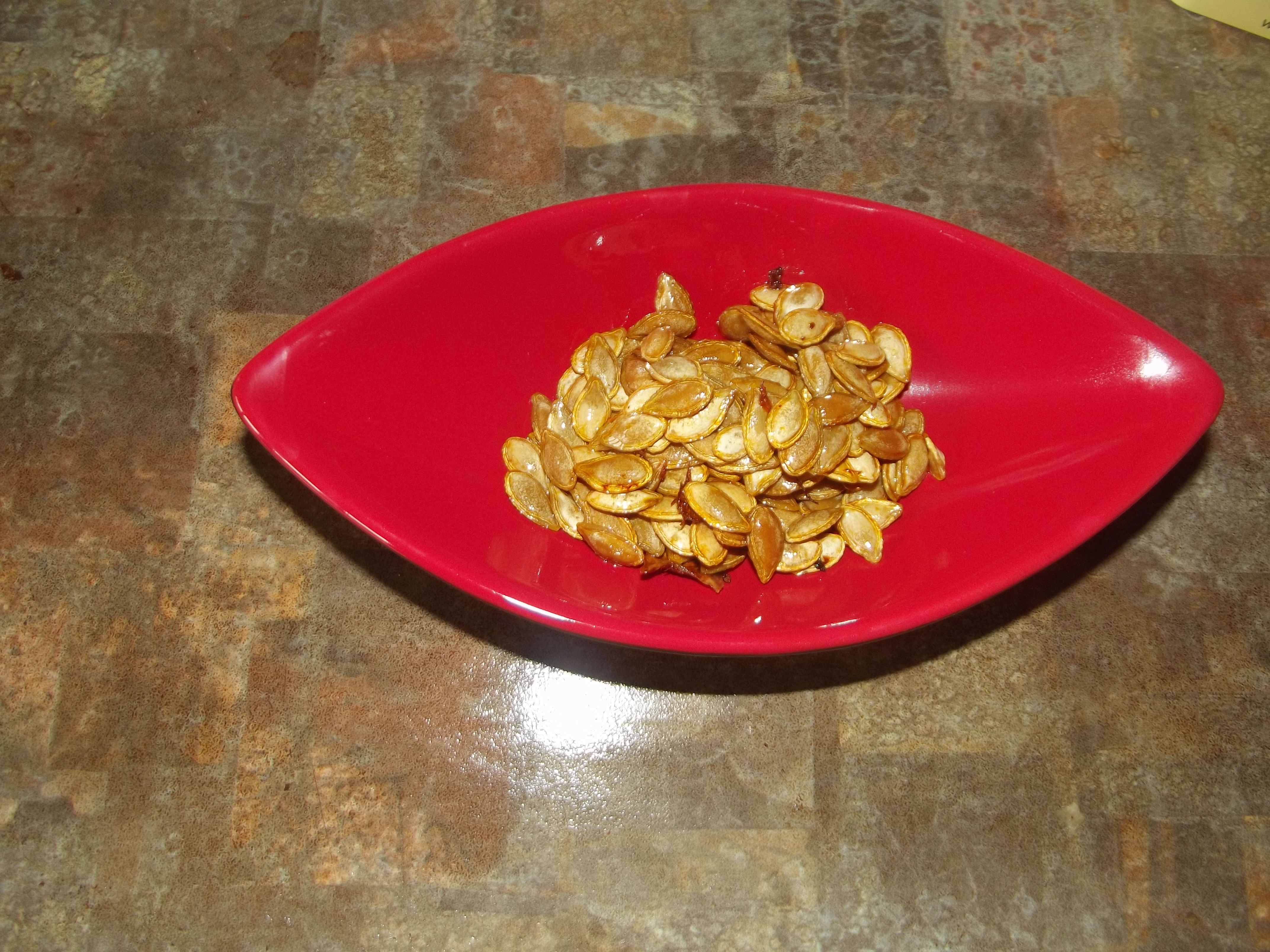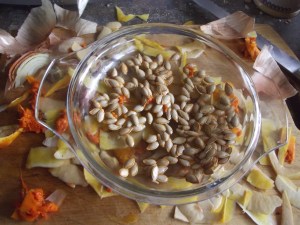 I bought a butternut squash yesterday and today I made it into soup… I peeled it and the peel went into the compost bin; it will rot down and be perfect for potting seedlings next spring. The squash went into the soup… and the seeds… went into the oven with a little olive oil and some sea salt.