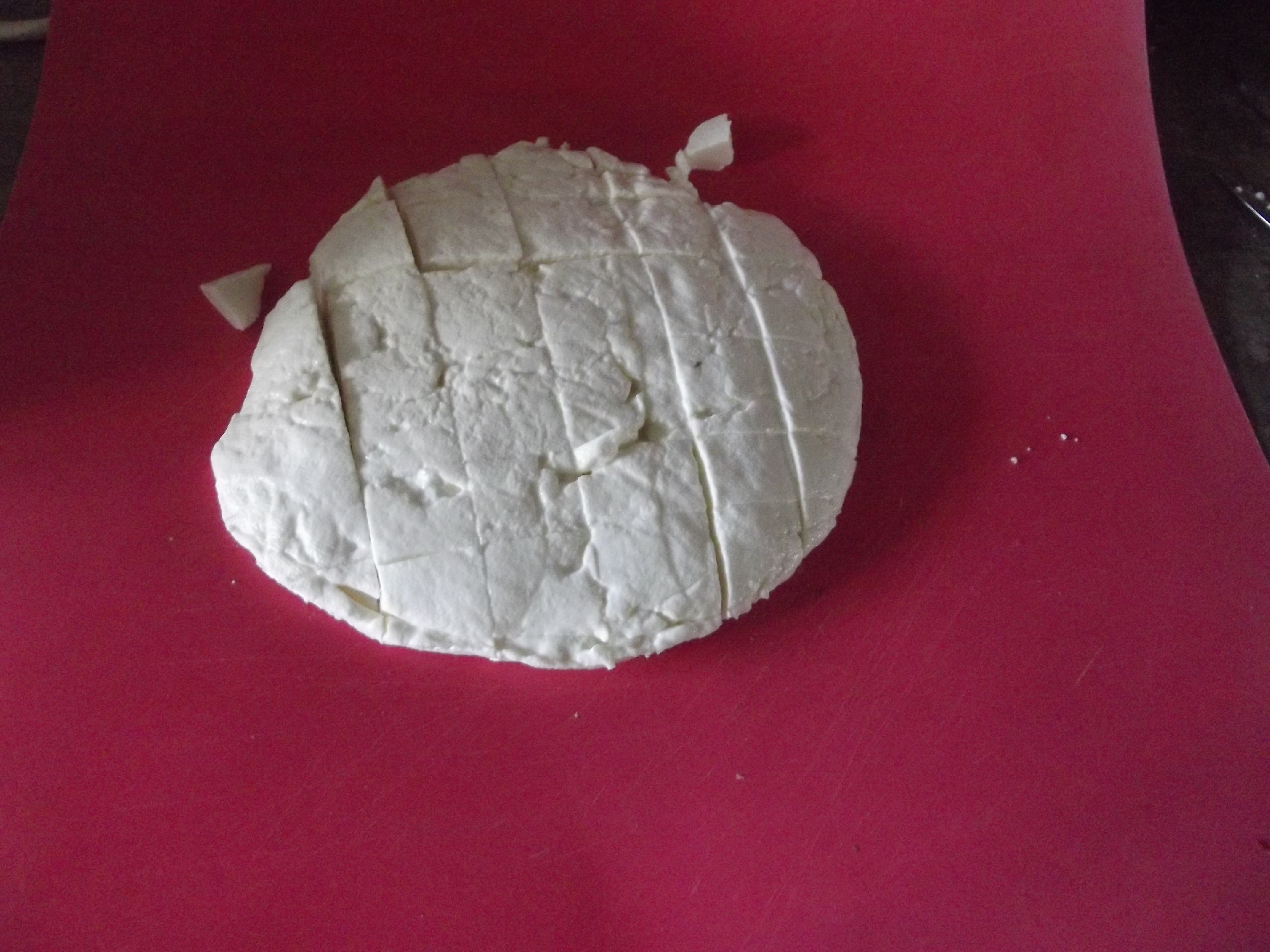 My messy kitchen… oh and some of the ingredients, the goats’ milk is in the pan…Heating milk, cream and yoghurt to 90°… with my new thermometer!When the milk has reached temperature, add the rennet, leave for the curds to separate and then drain through a muslin. After several hours of dripping (I left it over night) turn it onto a plastic board and cut into squaresSeparate squares and sprinkle with salt; prop up one end of the plastic board so the cheese can drain onto a tray underneath, sprinkle with salt…. and wait… and wait… and wait…