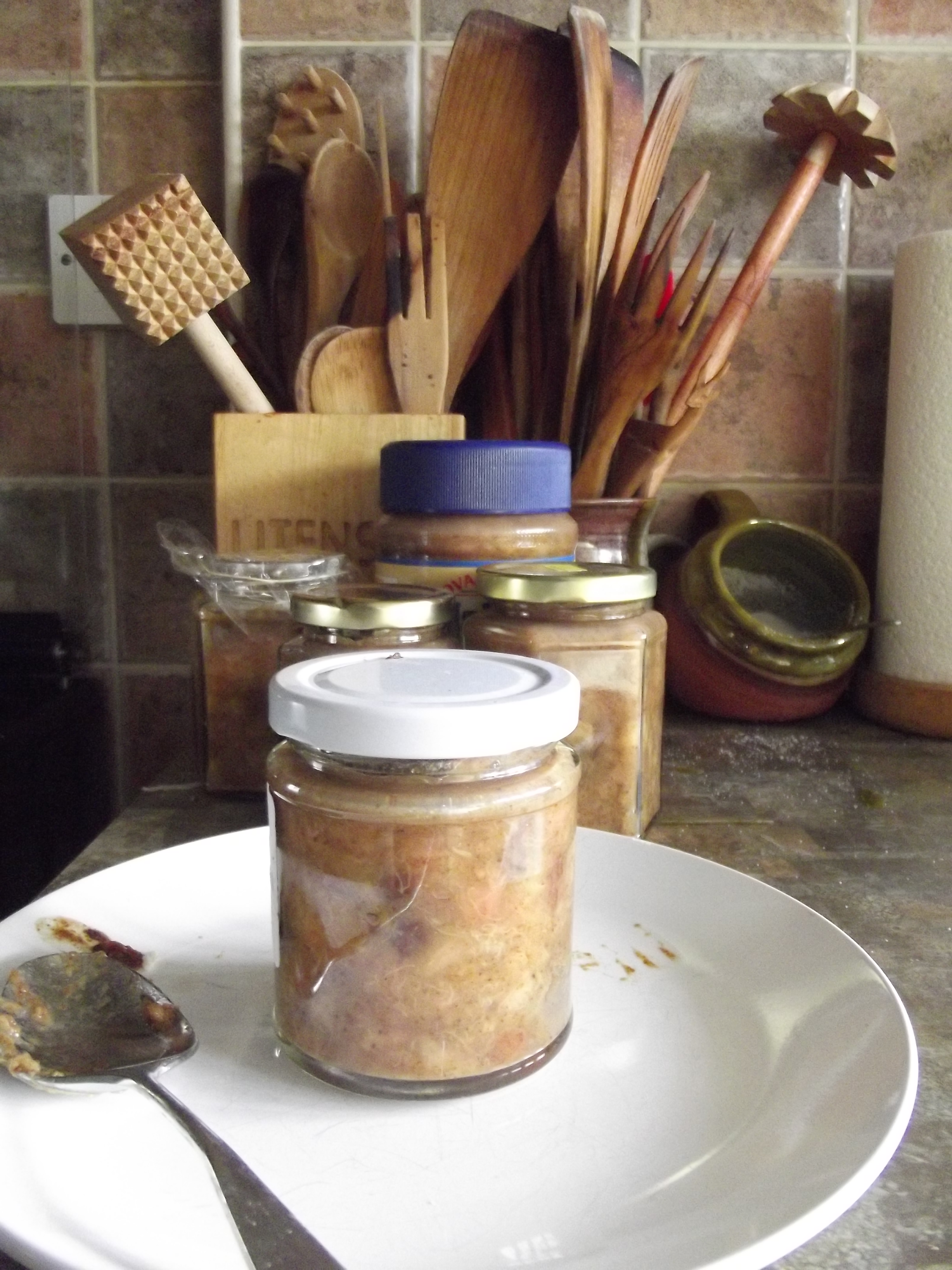 Bring to the boil, stirring so the sugar dissolves without catching, then cook on a low heat, or in a slow oven, or in a slow cooker until it is thick and ready to bottle. I can’t give a precise time because our parsnips had been frozen and seemed to give out a lot of liquid. Bottle into sterilised jars, wait a month (if you can) and enjoy!