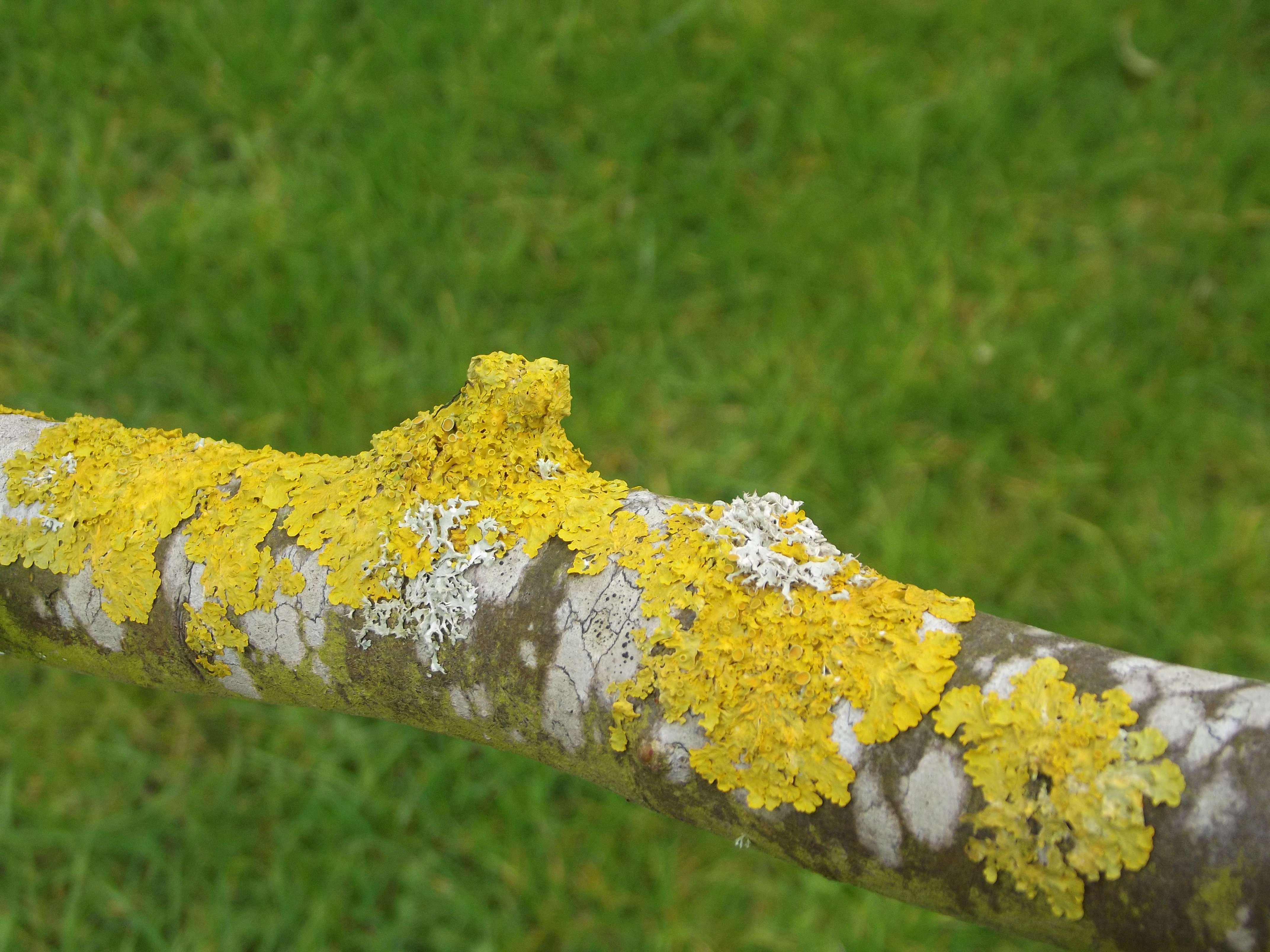 Three different lichens here, the grey underneath, the brilliant gold, and then the lacey green one