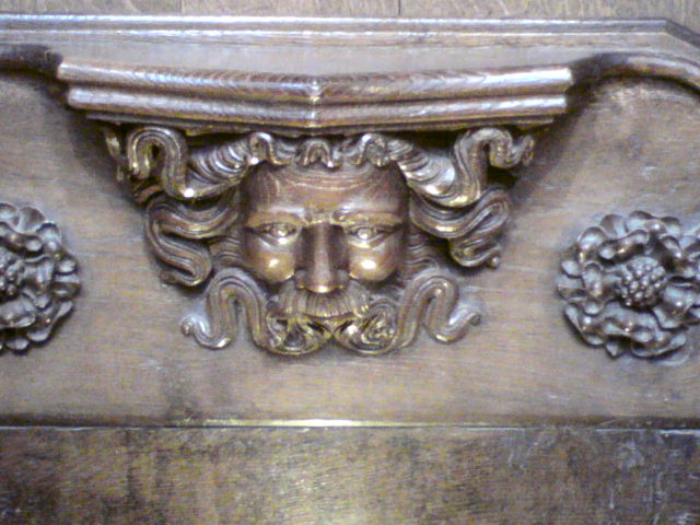 These representations show a man’s face peeping through or surrounded by foliage; sometimes the foliage is coming out of his mouth, sometimes it is coming out of his nose and eyes and ears too, sometimes his skin is leafy. Once you have seen one, you find yourself looking out for his brothers, and become quite adept at spotting them.