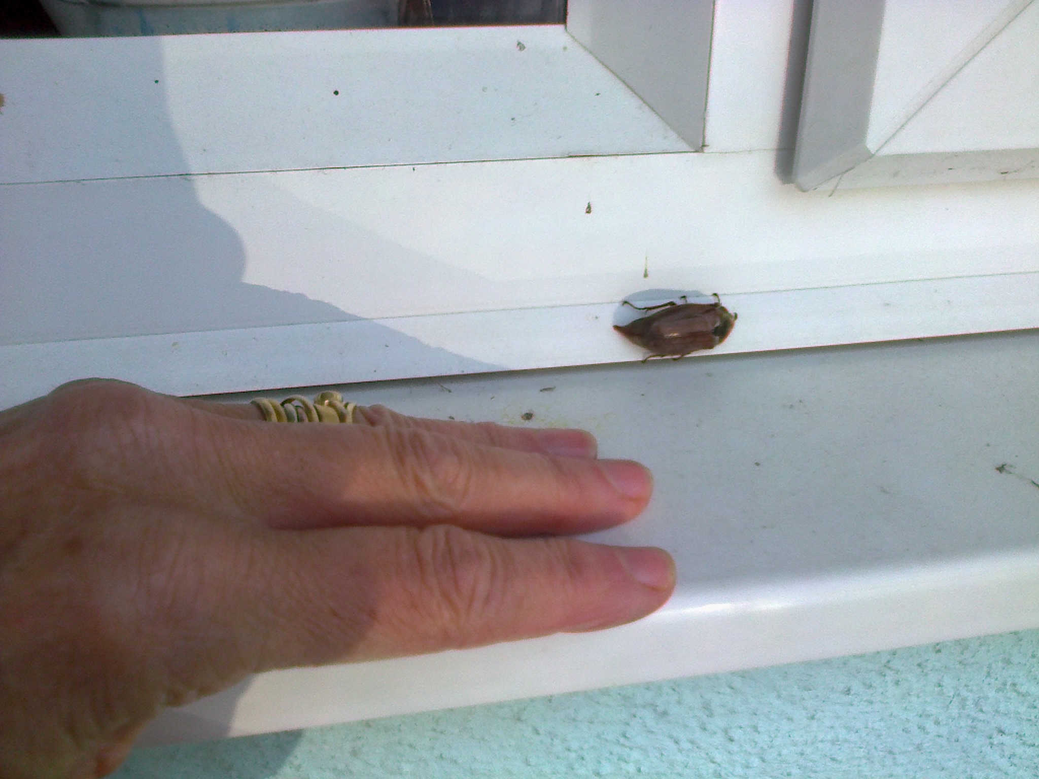 They are also called cockchafers (don’t laugh) and their grubs which are big and white and nasty eat roots of plants. The maybugs themselves used to be pests and destroyed crops on a huge scale; modern pesticides have controlled their numbers and we no longer get swarms of them. I saw this large fellow – actually it might be a lady, on the kitchen window sill and took a photo with my hand in the picture so you get an idea of how big it is.