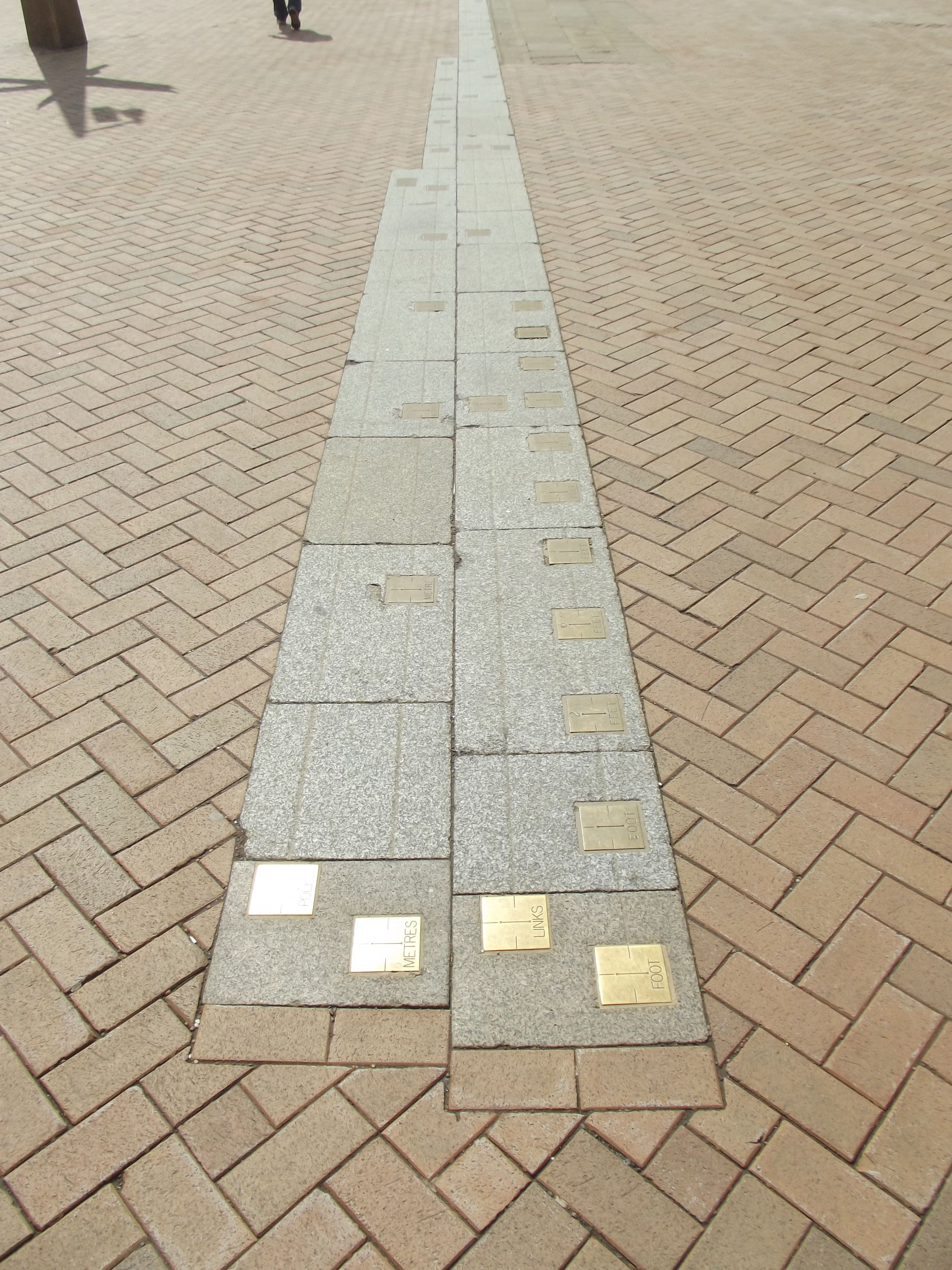 These little brass squares set into the granite slabs show the old pre-metric measurements, feet, poles and links, alongside the continental metres. Bring them back, I say, rods poles and perches, links, chains and leagues! Bring them back!