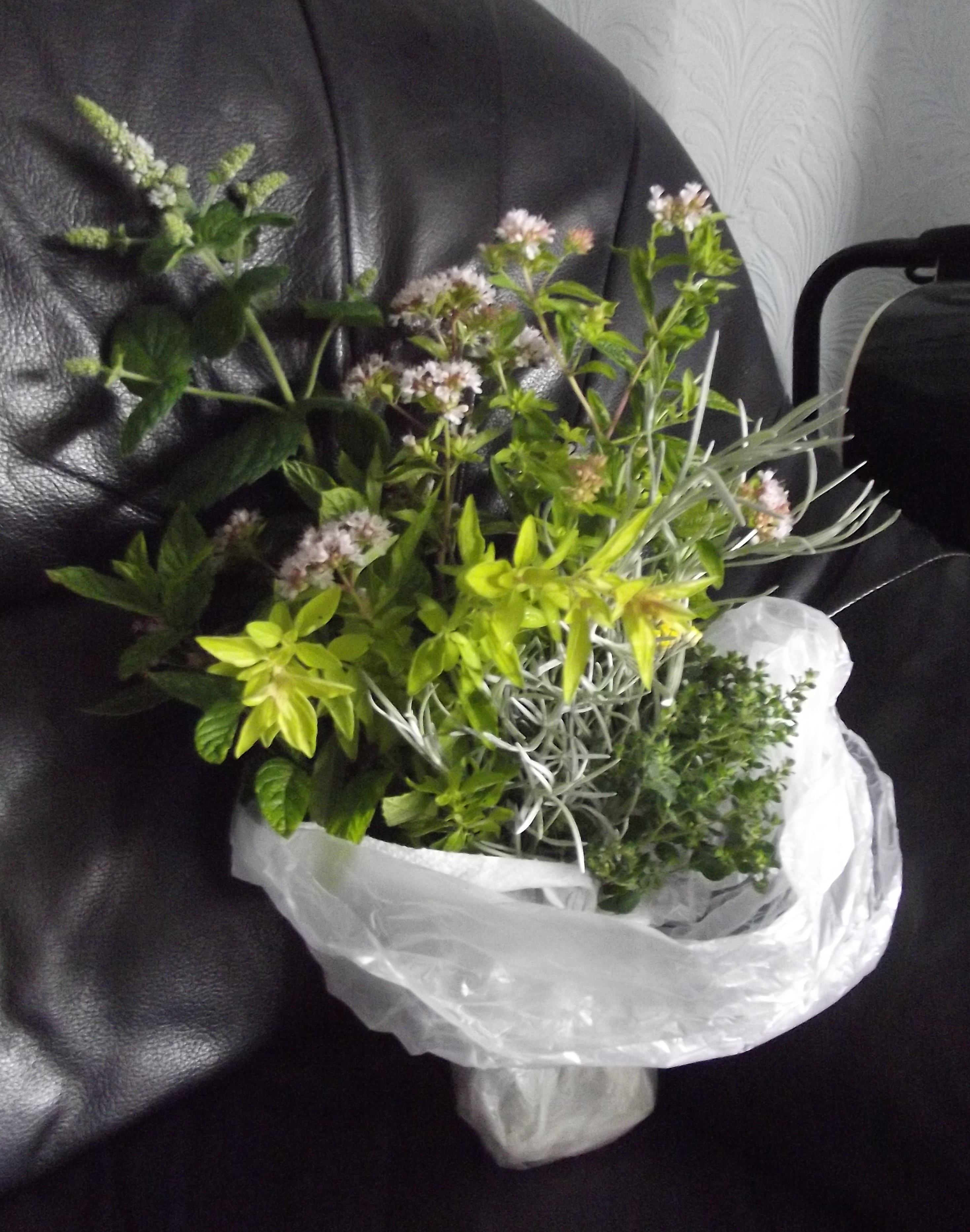 I like to take something when I go visiting, our garden seems bereft of flower at the moment, so what nicer (and more useful) than a nosegay of herbs, including, obviously, mint!