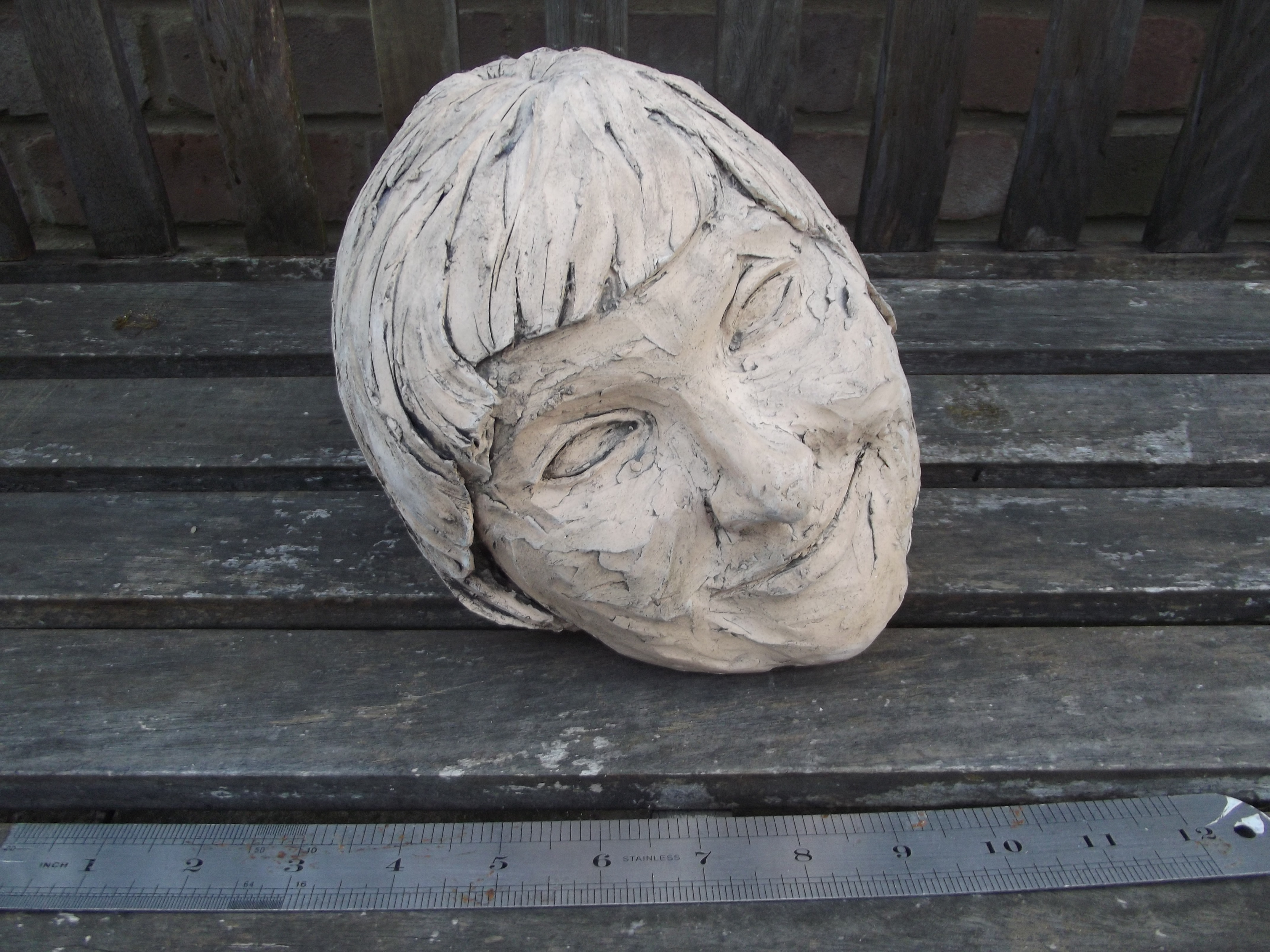 My sister is in a care home after an accident many, many years ago and one of the activities she most enjoys is ceramics. She is helped to make all sort of things, and her style is always distinctive, the colours she chooses are always recognizable. Several years ago there was a young man working there called Simon who was such a great personality. I’m not sure what his exact rôle was, sometimes he would be getting the residents to join in a sing-song, sometimes he would be running a quiz, and every week he worked in the ceramics class. He and my sister really hit it off, always teasing each other and laughing at the joke, and one day he challenged her to make a ceramic figure of him, and with a little help she made a clay head which certainly looked like him. As part of the challenge, he did the same for her; he was so gifted and clever it looked just like her. I told him that he ever wanted to sell it I would like it, I could give him the money or donate it to the residents’ fund at the care home. Several months later, it was Christmas… and guess what I got as a present from my sister, but really from Simon?