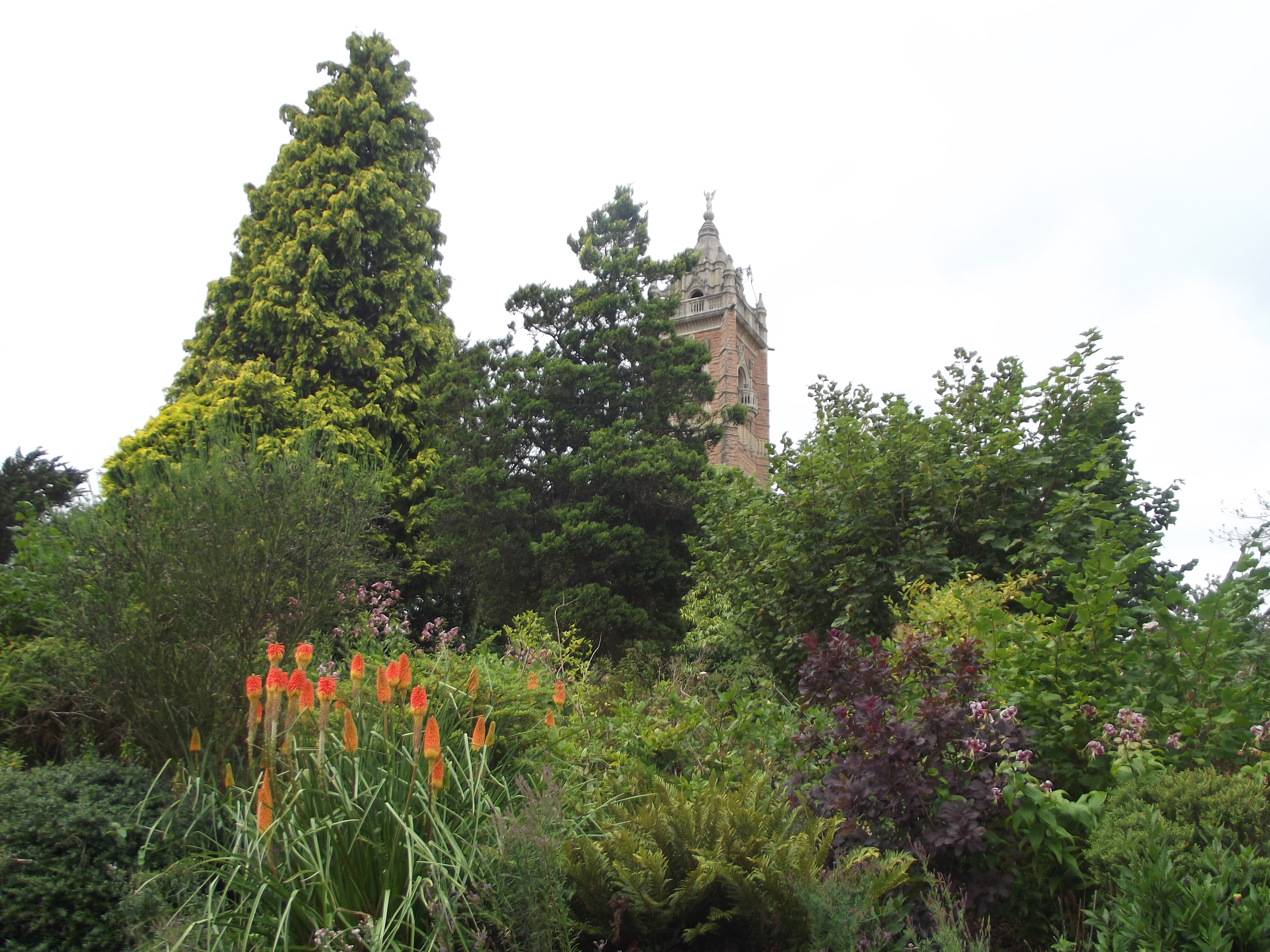 The gardens look lovely at any time of the year, because the foliage plants supply colour even when blossoms or other flowers aren’t out. The trees and shrubs have leaves of every shade of green and yellow, and quite a few copper varieties too. The paths to the tower snake round the hill so the tower gradually emerges, peeping between the branches of the trees and shrubs.
