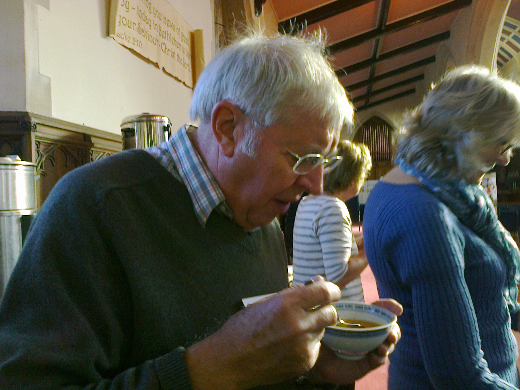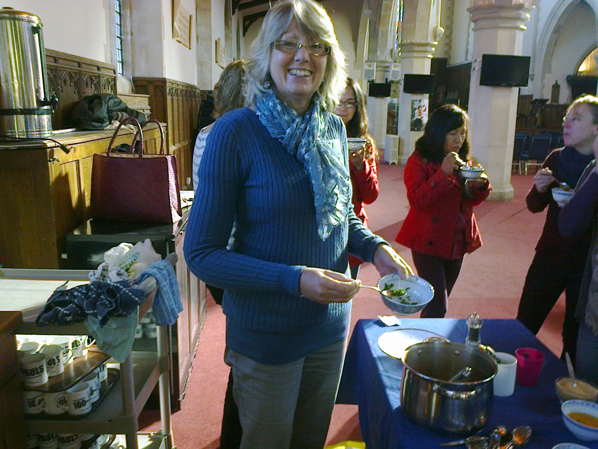 Today it was our English conversation class where a group of us volunteers teach English to people whose first language is something else. We always have a good time, but we work quite hard too. We usually start off with a quiz while people are arriving, ten associated items on a table and a mark for identifying them, a mark for a correct spelling! So today the quiz was about autumn vegetables which included swede, parsnip, marrow and squash. Then we normally have a grammar point and today it was prepositions. Then before coffee we have the answers to the quiz and the prize awarded (chocolate!); after coffee we divide into groups to work at different levels, and then back together again for bag time… where we take it in turns to bring in objects to ‘show and tell’; it was my turn today so i brought in everything to do with making soup, including chopping board, apron, ladle and pepper mill. The focus was on soup, because today’s coffee break was actually a soup break!