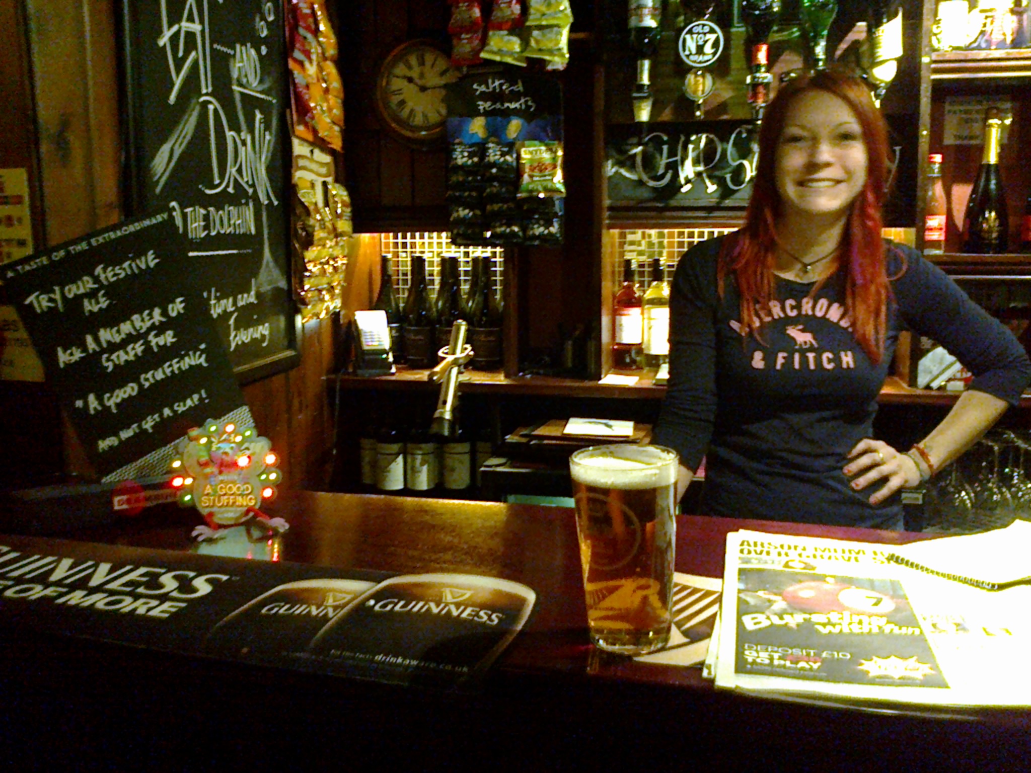 Lovely Alice posing behind a freshly pulled pint of the newest beer on offer at the Dolphin, the best pub in the world, and a flashing beer pump label