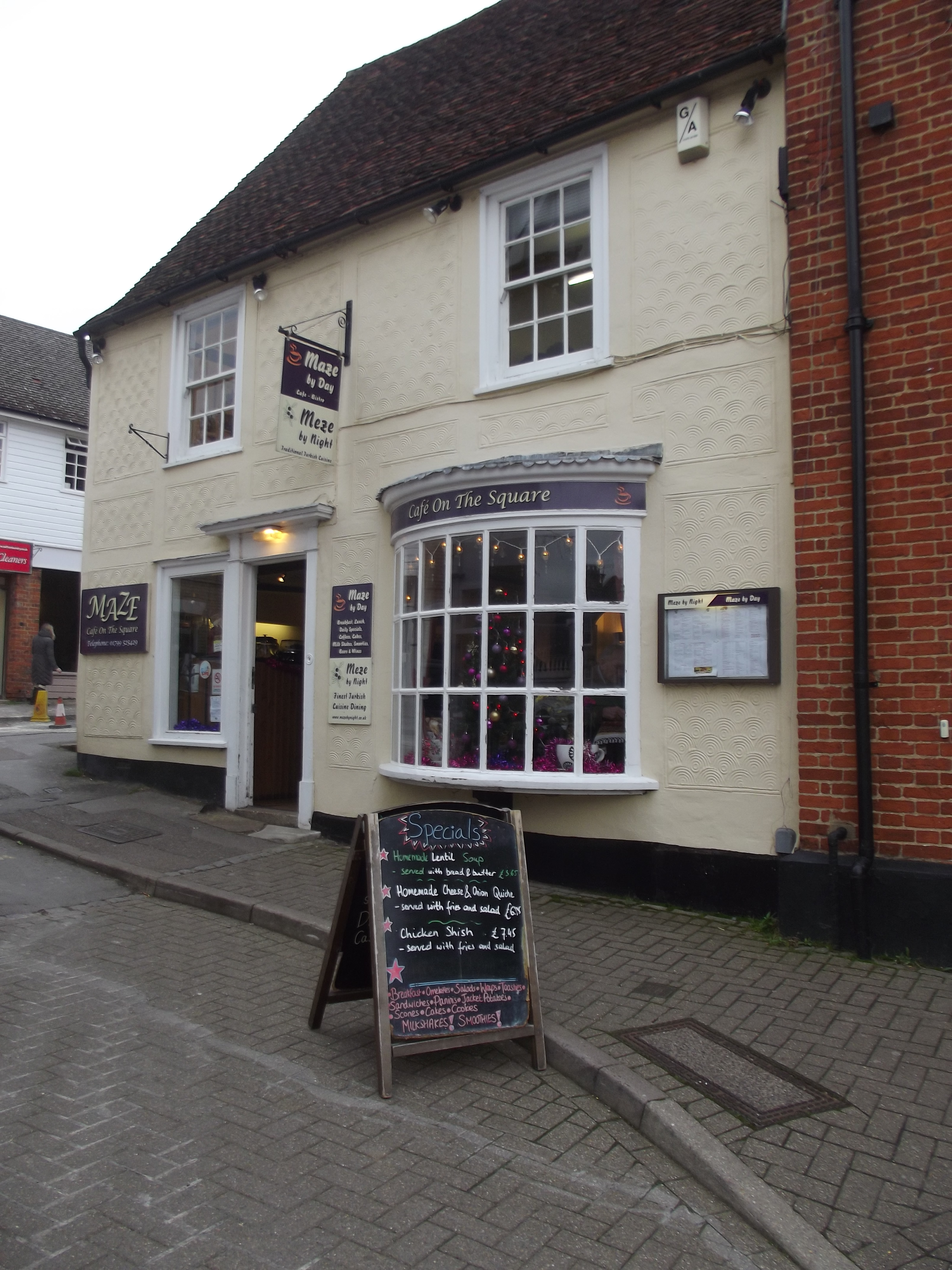 Dropping into Saffron Walden we had great difficulty deciding where to go to eat, there were so many nice and tempting places offering us lunch. We went into a little café-cum-restaurant, called the Maze Cafe by day and the Meze Restaurant at night. We had a lovely lunch… so when we were also in the area a couple of days ago and feeling a little peckish, we parked in saffron Walden and wandered through he pretty streets until we found it again.