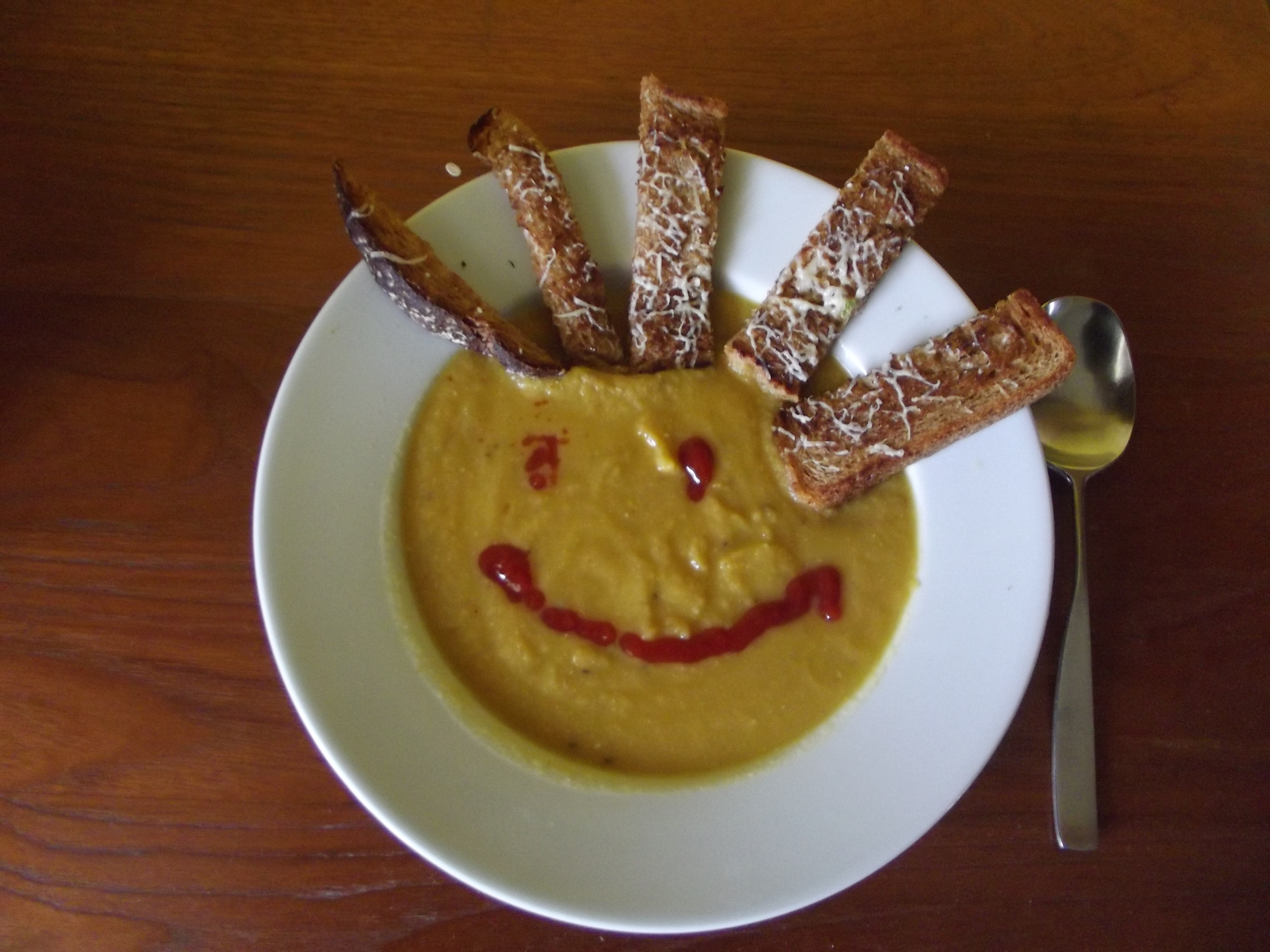 Parsnip and leek soup, with cumin, coriander, dill, anis seeds, fennel, coconut and cheesy toast fingers!