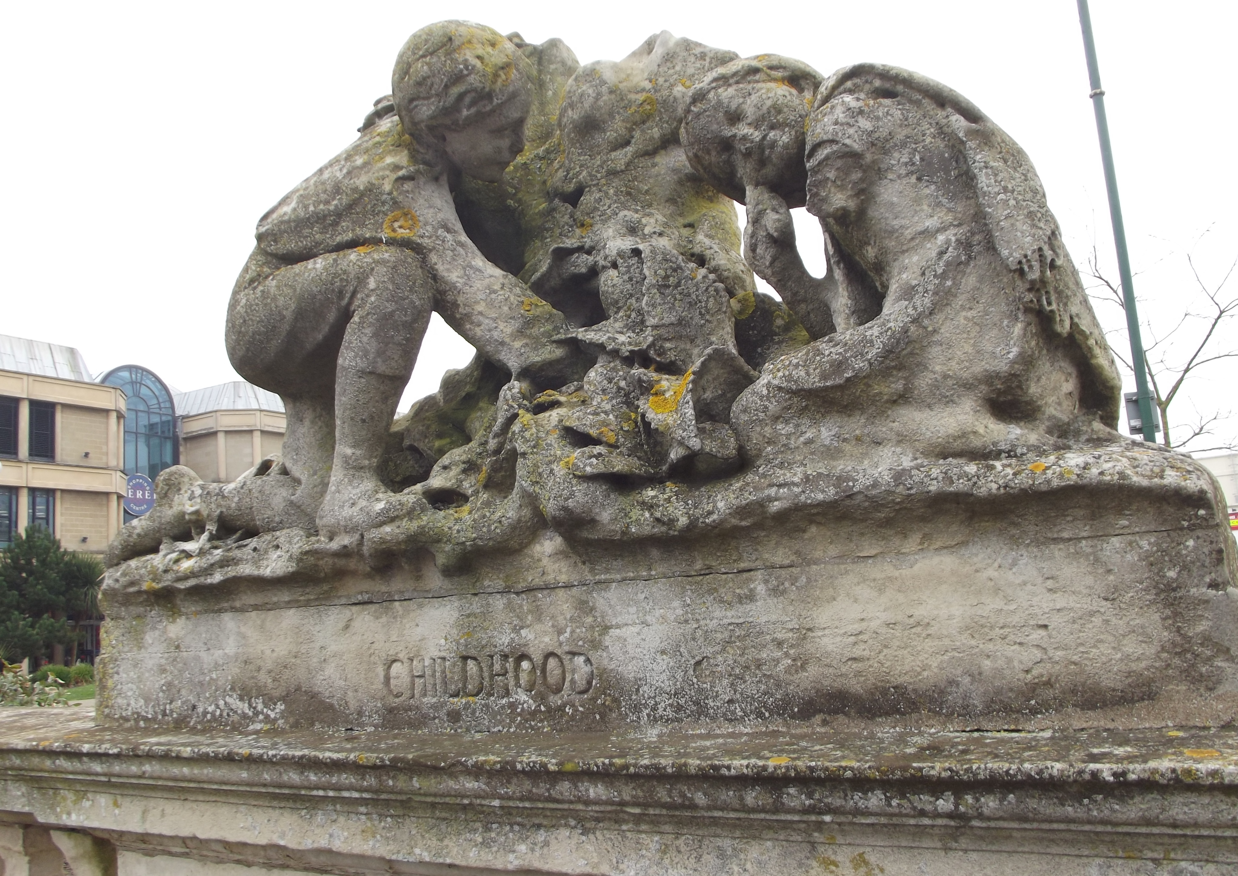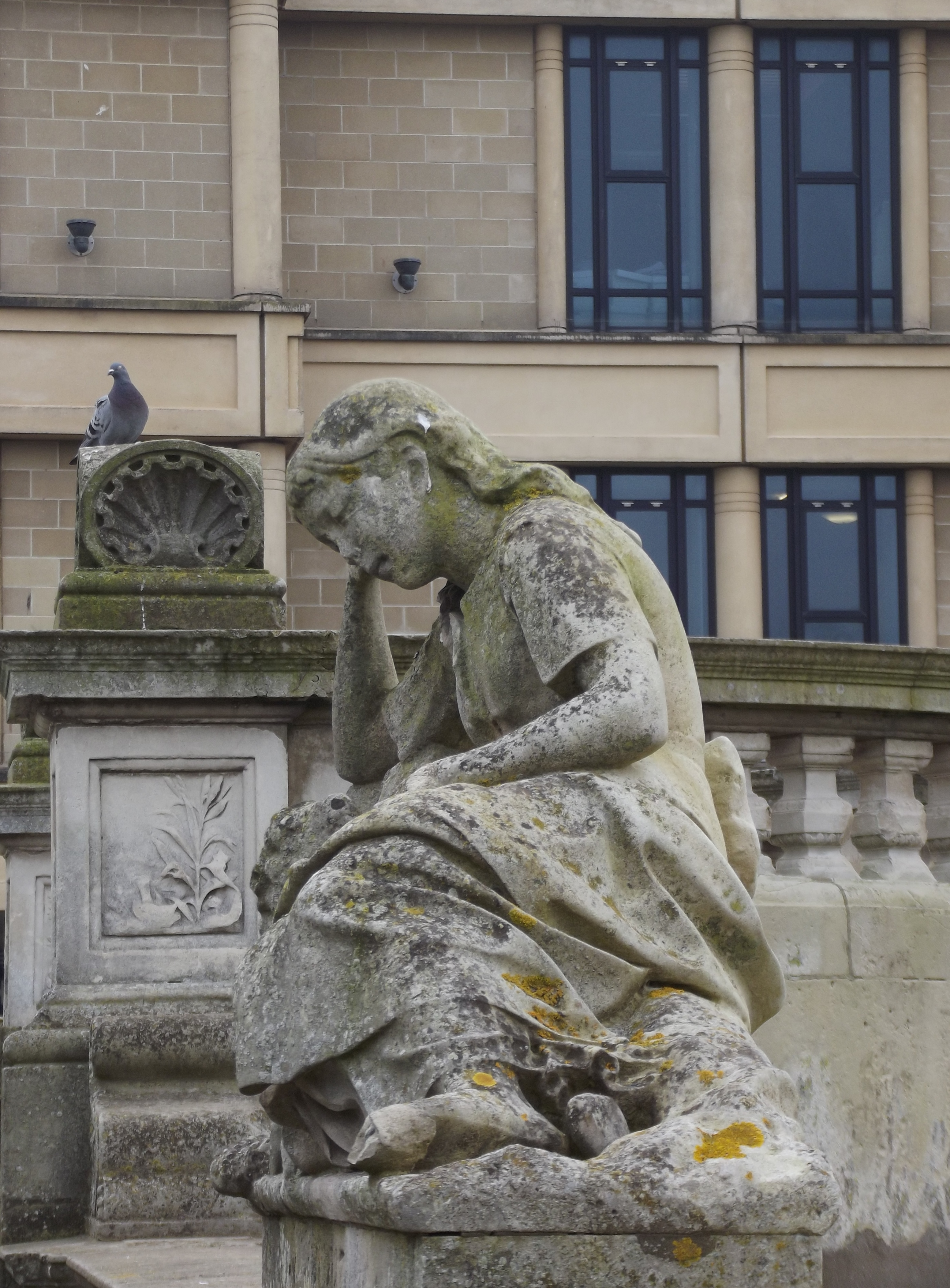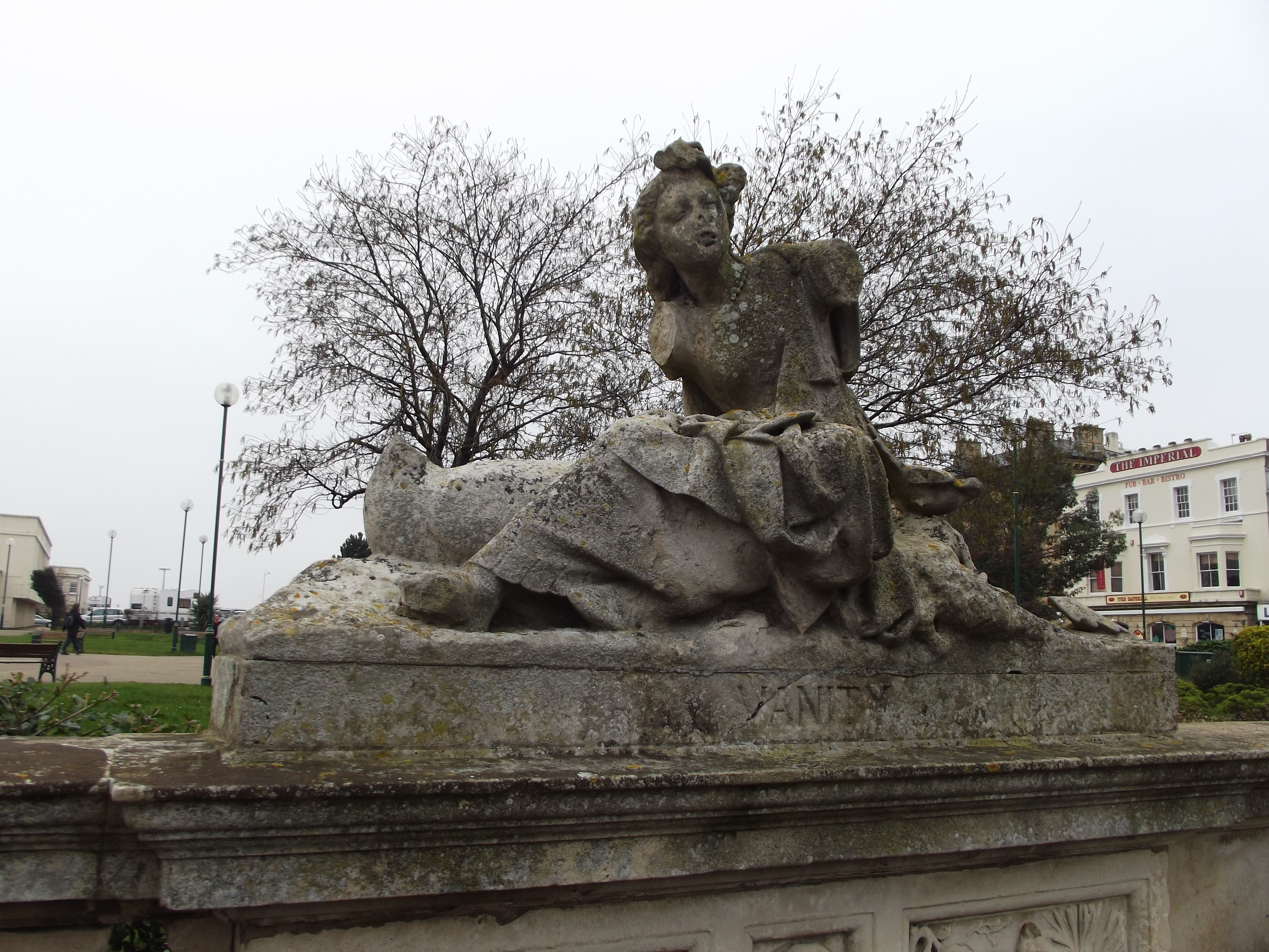 A low wall separates the garden area from some lawns and the high street, and along the top of it is a series of statues, some very badly damaged, no doubt by vandals thinking it was fun to render poor Vanity armless and prevent the woman gathering the harvest from doing so by taking away her hand.