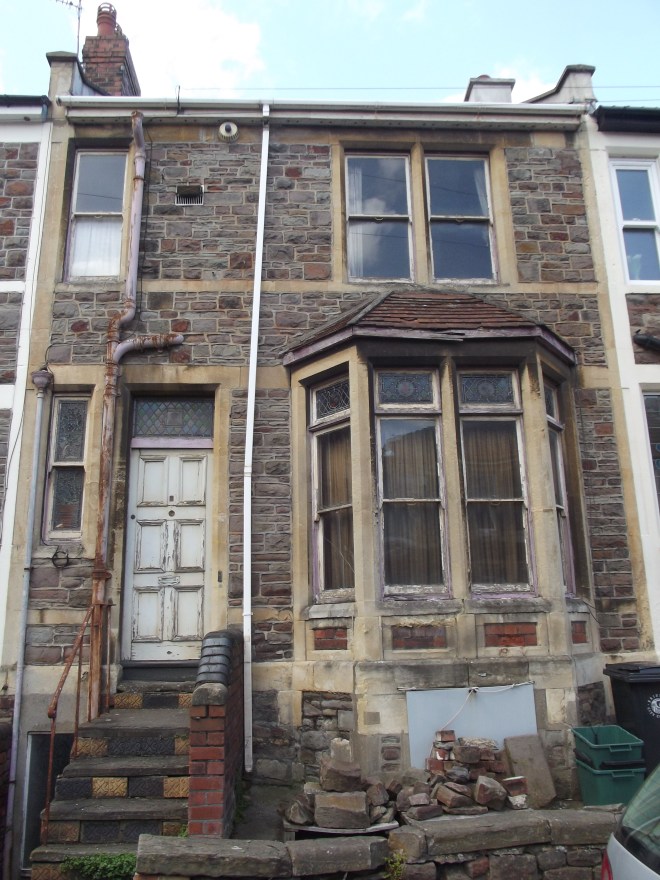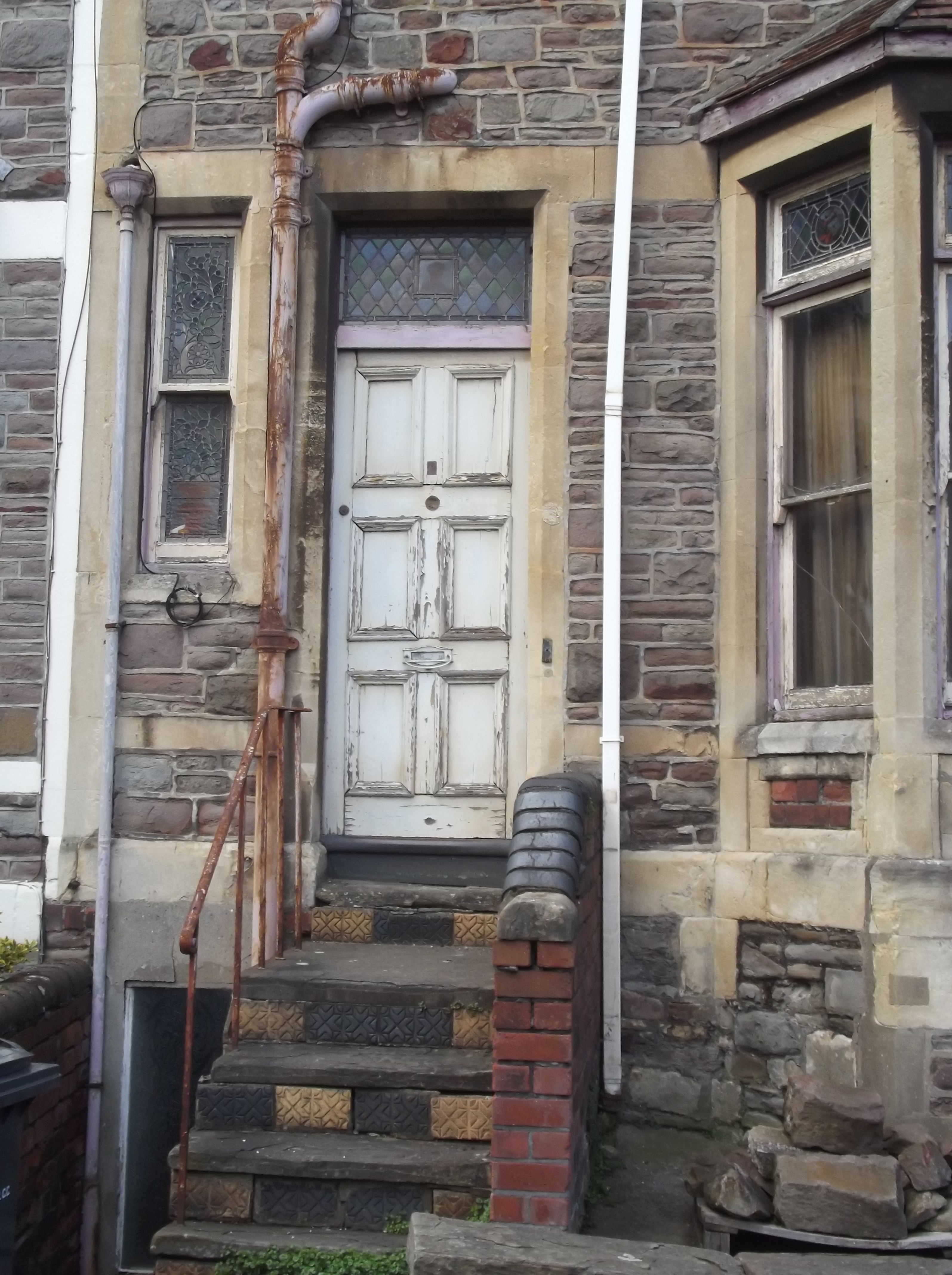 We were in a suburb of Bristol, a busy place with a wonderful array of different shops, interesting cafés and nice looking pubs and bars. Because it is busy it is almost impossible to park so we drive round to the side roads and the car park where we used to leave the car has been built on. As we parked, we noticed this house which was in such a sad and sorry condition but once would have been lovely. it still has the original stained glass in the windows, it still has the patterned brickwork leading up to the front door, and judging by the rust on the drain pipes, they are the original iron ones too.