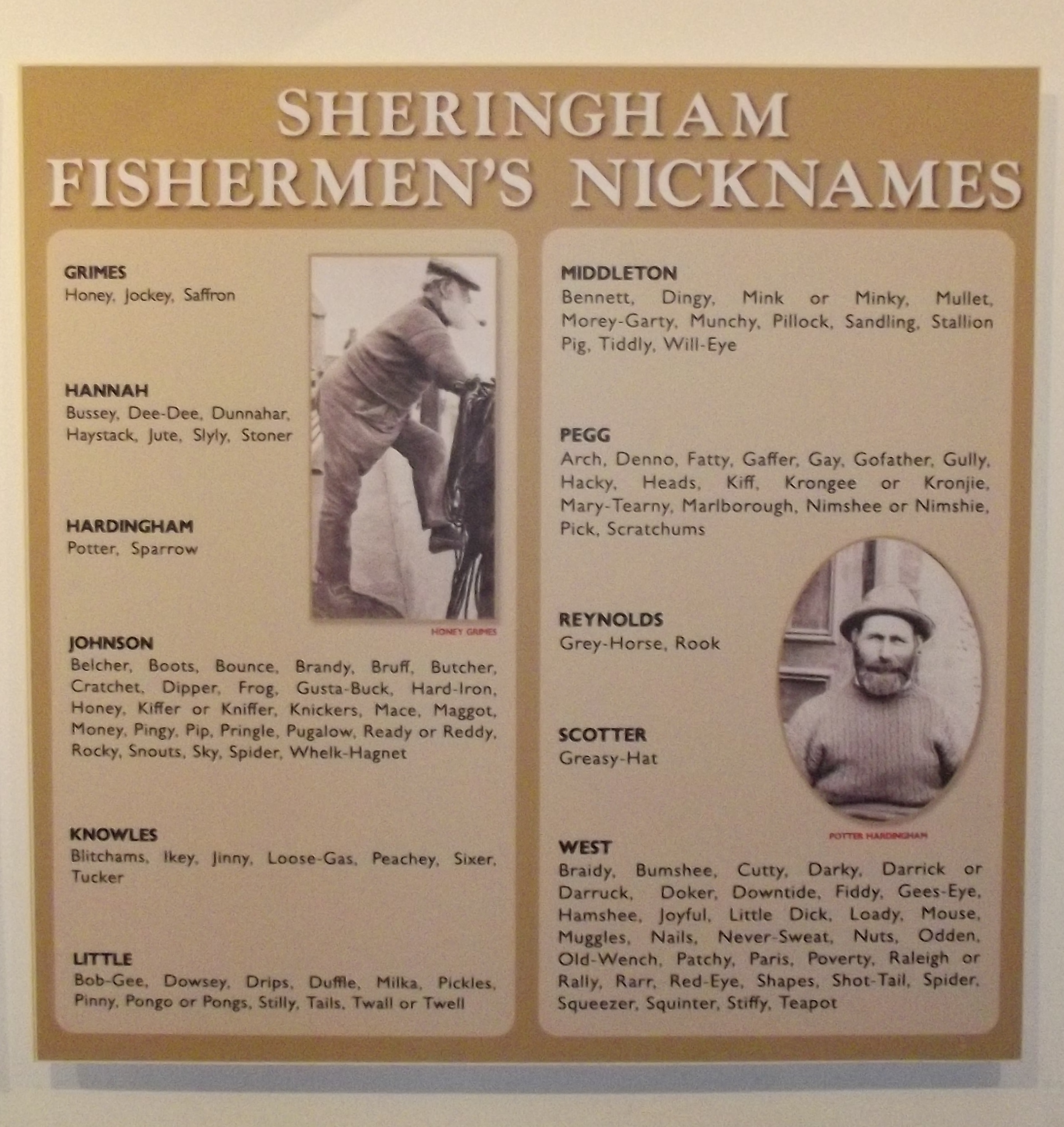 I’m sure other countries give people nick-names, and certainly it happens here. In Sheringham, fishermen used to be given the most imaginative, and sometimes downright strange nick-names! How or why would someone called Grimes get the nick name of Honey, Saffron or Jockey? With Belcher Johnson or Drips Little it doesn’t take much to guess how they acquired their soubriquets, but Krongee Pegg? Hamshee West? I like to imagine what Scatchums and Whelk- Hagnet looked like!