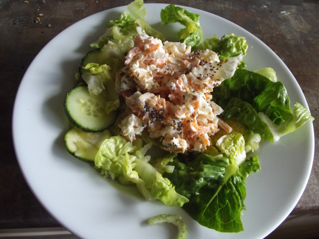 One day I was somewhere… and I can’t remember where, and I was given a jacket potato with coleslaw… t must have been at someone’s house because I felt obliged through politeness to have a little attempt to eat at least a little of the coleslaw… well, it was yummy! It was a revelation, and when I enquired where my host had bought it the answer was, she had made it!