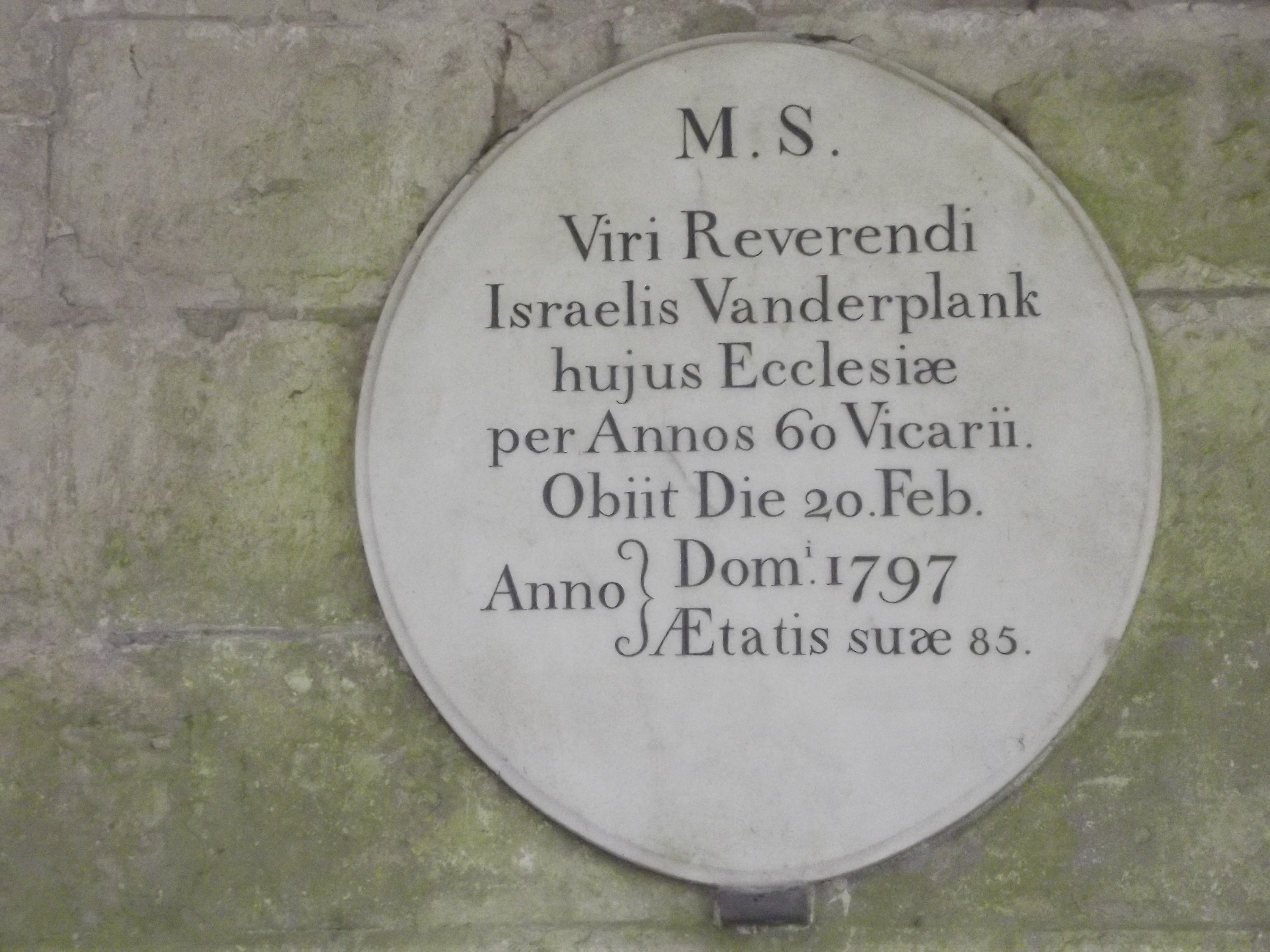 Israel Vanderplank was a procurator of the vicars choral at Salisbury cathedral and this memorial plaque commemorates his life. I was struck by the unusual name, and trying to find out more, I find that there was also an Isaac Vanderplank who was connected with the church. Israel was the vicar at Salisbury Cathedral for sixty years and died in 1797 at the age of eighty-five.