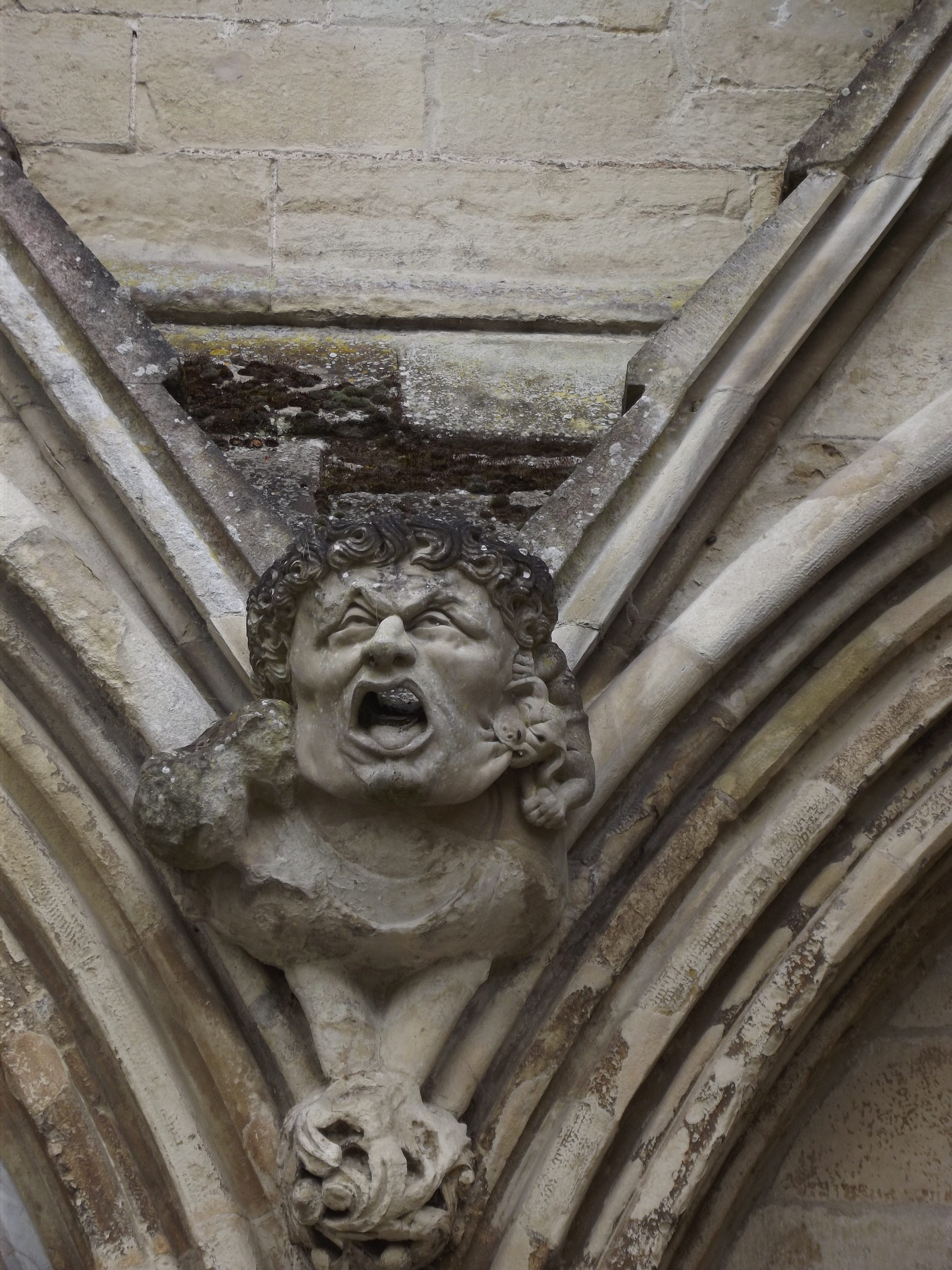 This poor chap is having his cheeks clawed or bitten by some sort of beast. He has a very realistic face, he himself is not ugly, it’s his expression that is distorting his features, so I wonder if it is based on a real person, a real person who gave the stone mason a hard time?
