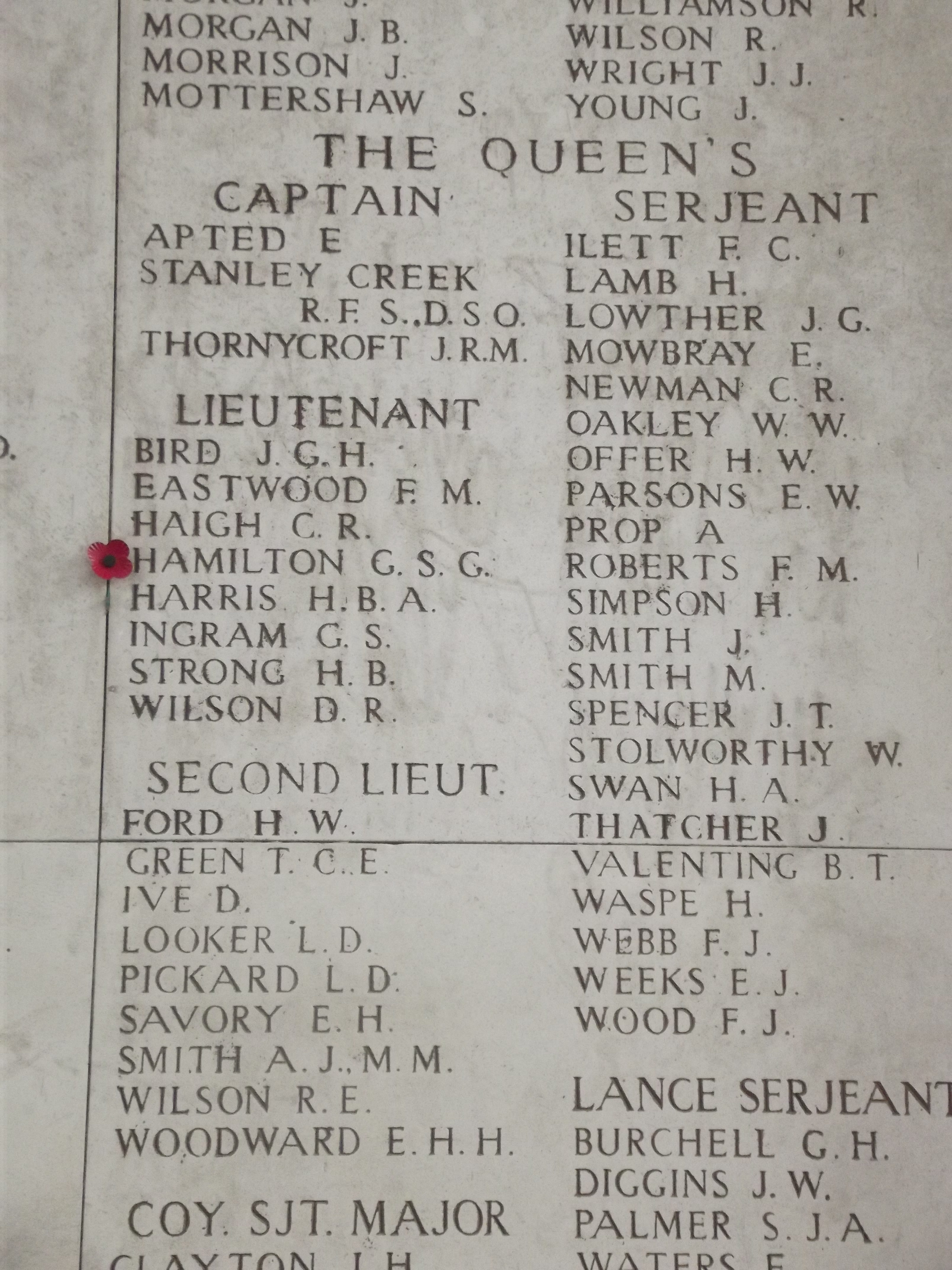 Alfred along with 54,388 officers and men from United Kingdom and Commonwealth Forces who fell in the Ypres Salient and who have no known grave, is commemorated on the Menin Gate in Ypres. As the soldiers marched to war away from Ypres towards Menin, they joked that the last one out should shut the gate. This monument on that very road was built and named the Menin Gate.