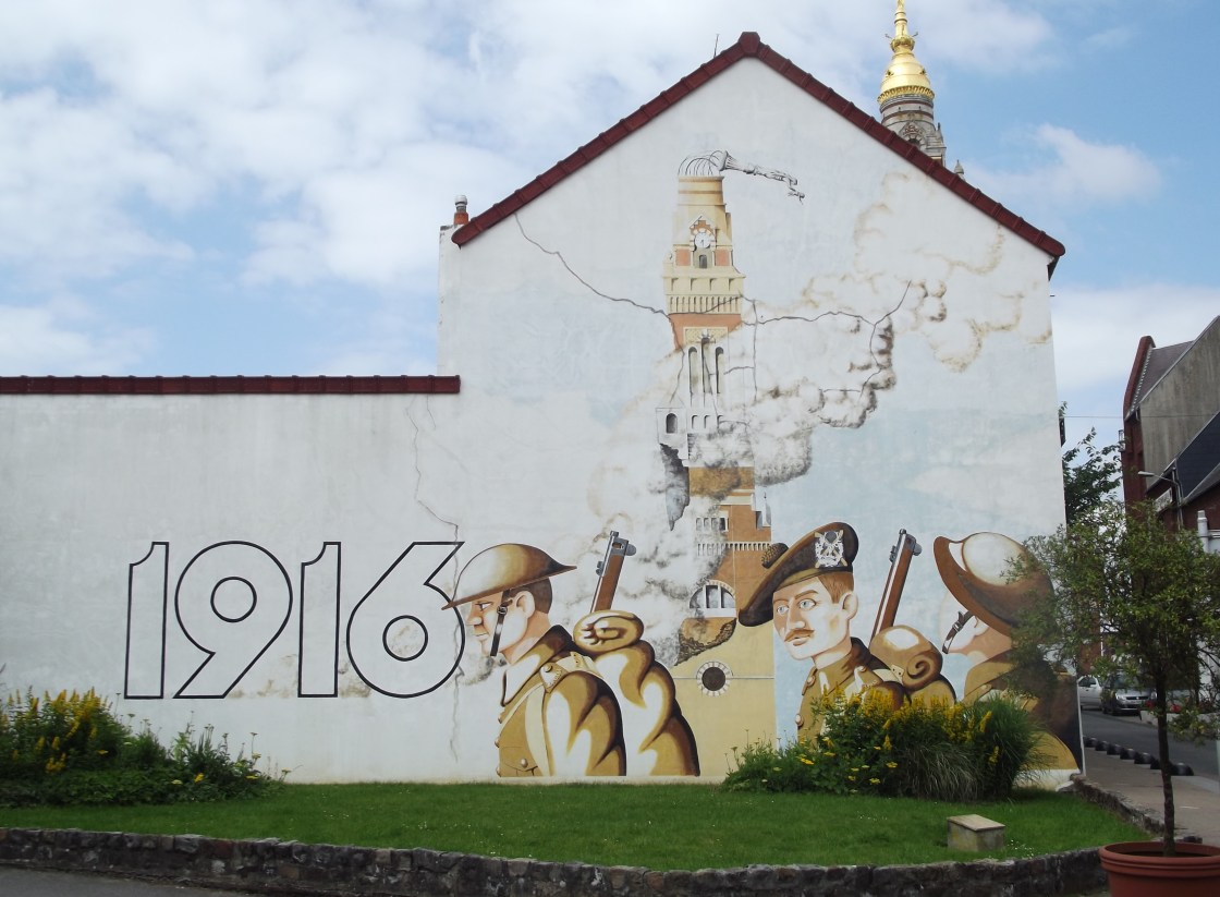 Albert became famous because of what happened to the statue on the top of its church. You can see in the background of my feature photo that the church has a gold cupola and golden statue surmounting it. The statue is of the Virgin Mary and was made by the sculptor Albert Roze. In the mural on the side of the building you can see what happened to the statue in 1915; it was hit by a German shell and tipped sideways but didn’t fall. It was said that whoever made the statue actually fall from its precarious position would lose the war… I think it may have been British who caused the statue to fall and disappear… however it is now resplendently back, standing above the town.