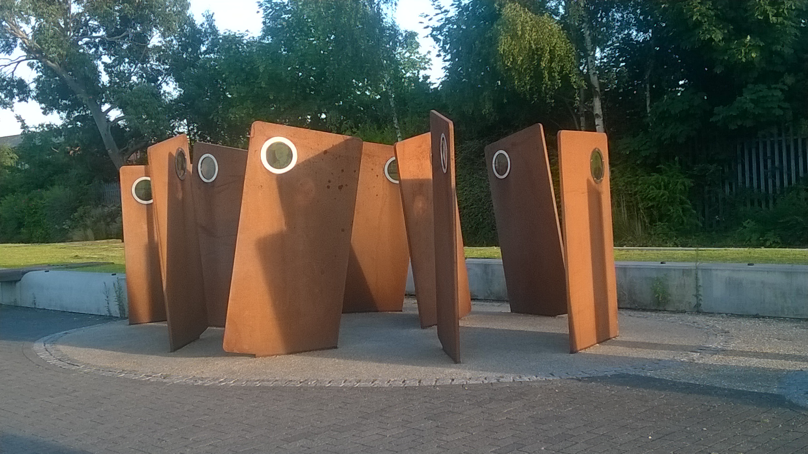 This sculpture, Casuals, can be found on Salford Quays as part of the sculpture trail by Stephen Broadbent in 2010 with the help of former Salford Dock workers and their families.