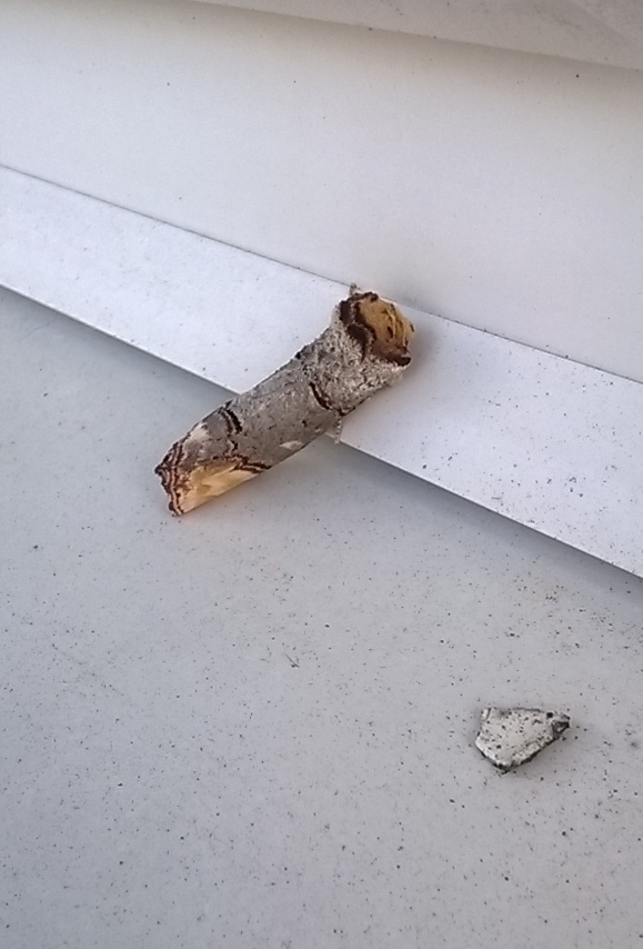 We saw this moth perched on our window sill as we set off to go on a visit. I looks just like a broken off bit of twig, and that is its camouflage! it is called a buff tip moth and apparently is common throughout the K. It must be very good at disguising itself because this is the first one I have ever seen! It is trying to look like a bit of silver birch which is strange because the caterpillars which are black with thin yellow-green lines along the length of their bodies, and thick yellowy brown bands running round them eat mainly lime, oak and elm leaves. The caterpillars also have black heads and a row of black spots along their sides.