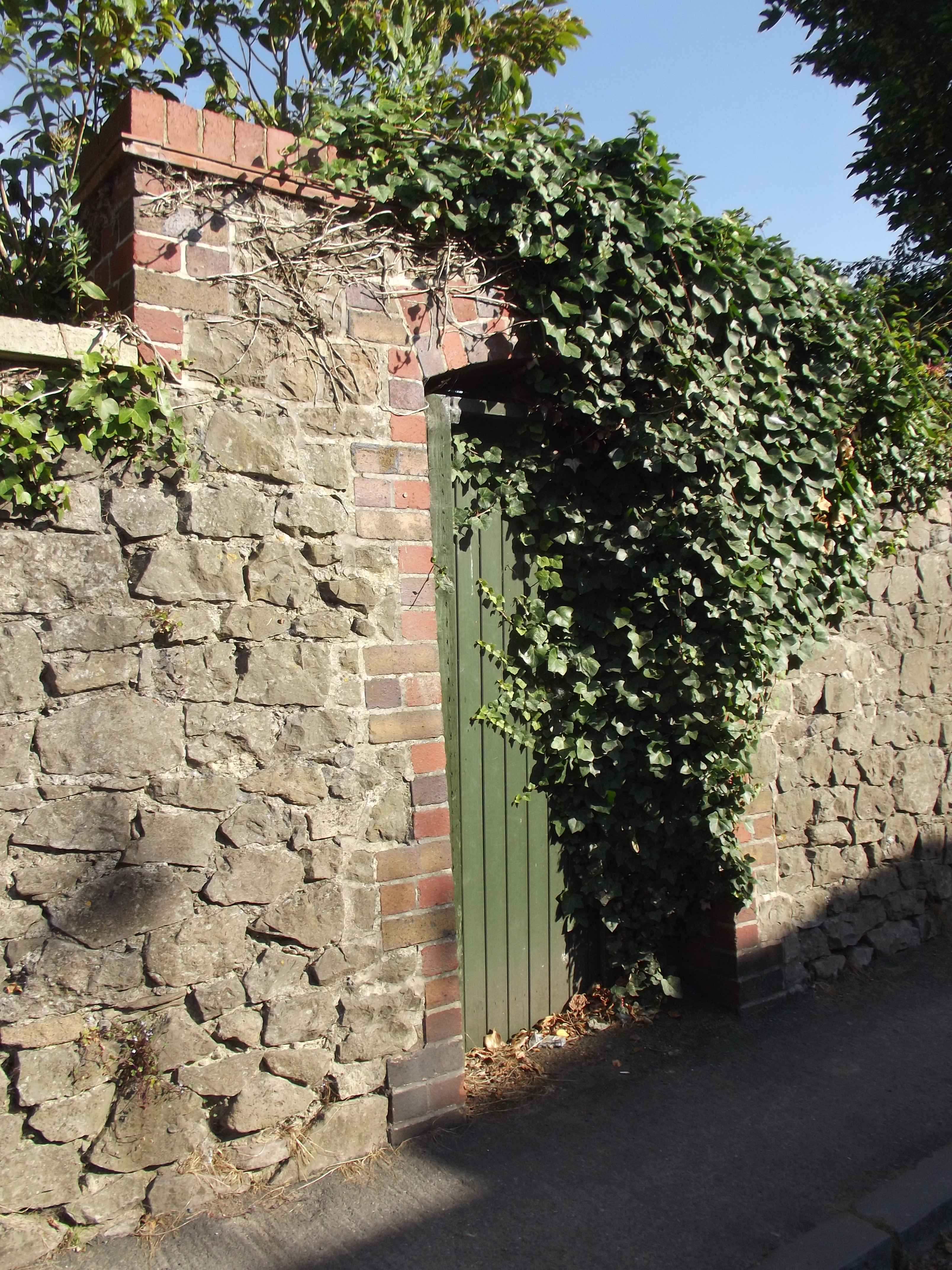 I am rather taken with unexpected doors, doorways, gates, stairs leading nowhere, bricked up entrances… and this one; it’s a door in a wall that I walk past several times a week in our village. The wall is neat and well-maintained, but it is too high to see the house beyond it. I’m sure there must be another entrance, but I’m in no hurry to look for it, I prefer to imagine that this is the only one and there is some mystery as to why it is so rarely used that ivy has grown across it and round it, and squeezed through the gap between the hinges.