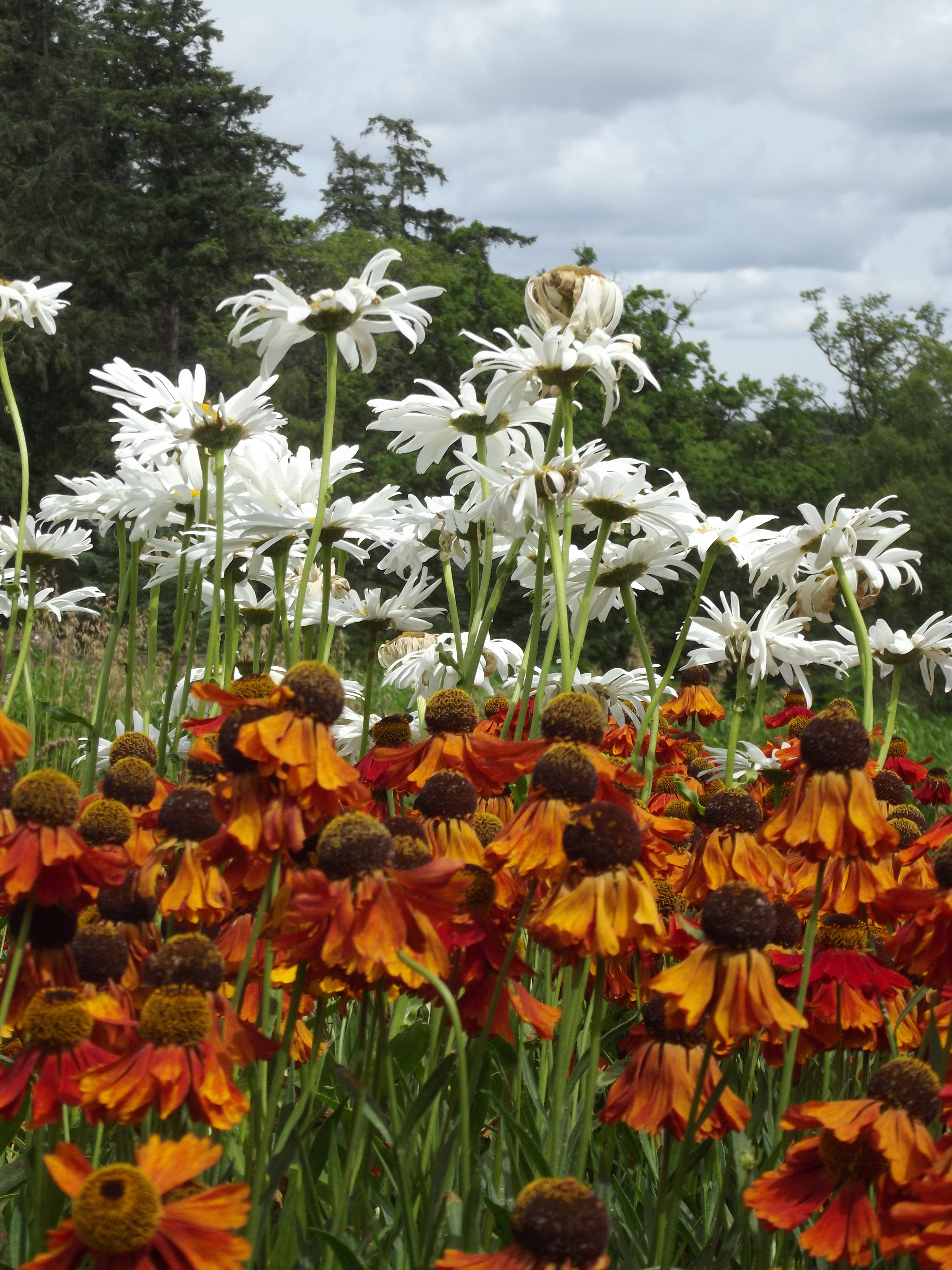 Sometimes you see two unexpected colours against each other and they just seem to work… I’m not an artist and so I don’t know anything about the theory of colour, and maybe the colours I saw adjacent to each other in the walled garden at Knightshayes Court are a classic match… I saw these clumps of flowers, some white daisy-looking things, and some bronzy daisy-looking things with their petals swept back from the centres as if they were wearing hair bands, and I just thought the colours were charming together… they would make a lovely pattern for a fabric, I can just imagine a nice blouse or a summer dress with a jacket…