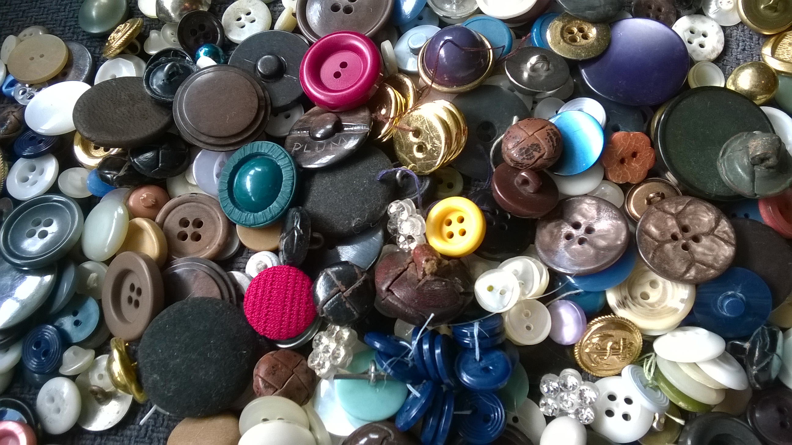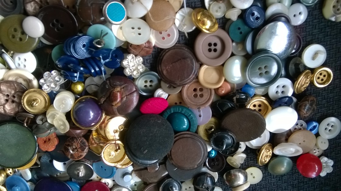 In the button tin were old buttons, some made of bone or shell, some may even have been made from cheap ivory, metal, leather, wood, and early forms of plastic. There would be buttons from dresses which I would remember her wearing, or that she had made for me and my sister, shirt buttons from things she made for dad, coat buttons that she would have bought to replace lost buttons from coats we had bought, tiny buttons from knitted garments… all sorts, in every shape, colour and size.