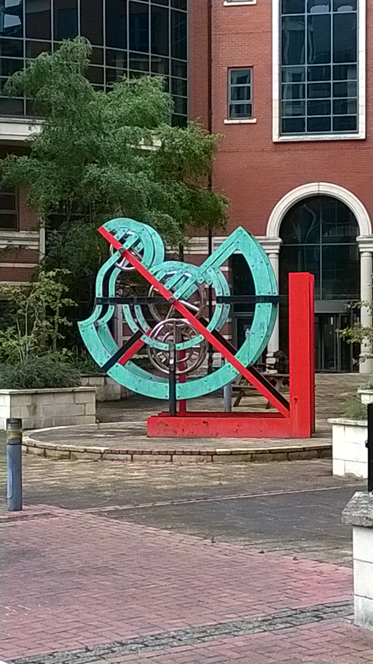 Maybe there is a plaque which would have told me what it was or what it represents or what it was called or who made it… but we were on our way into the city so we didn’t stop. So I don’t know what the sculpture represents – if it does represent anything and isn’t an abstract, but I liked the colour, I liked the geometry of the design and that it didn’t quite match itself, the outer blue circle not being complete and set at an angle…