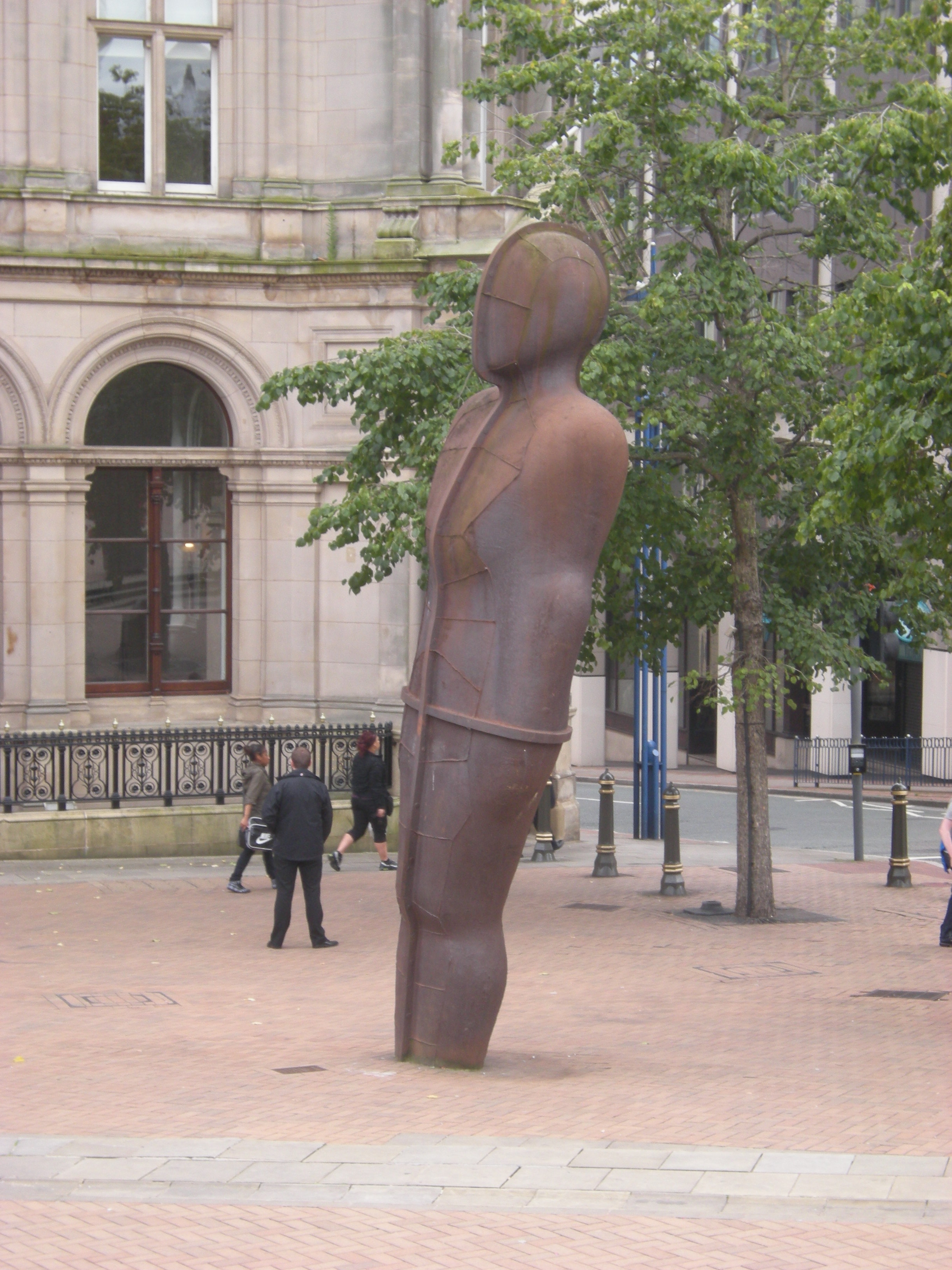 Iron: Man… known as the Iron Man is a statue by Antony Gormley, an artist known for the Angel of the North and many other figures made in a variety of materials. This leaning man can be found in Victoria Square, Birmingham. He is 20 foot tall, and this includes his feet which are buried beneath the pavement. He weighs 6 tons and his actual lean is 7.5° backwards and 5° to the left.