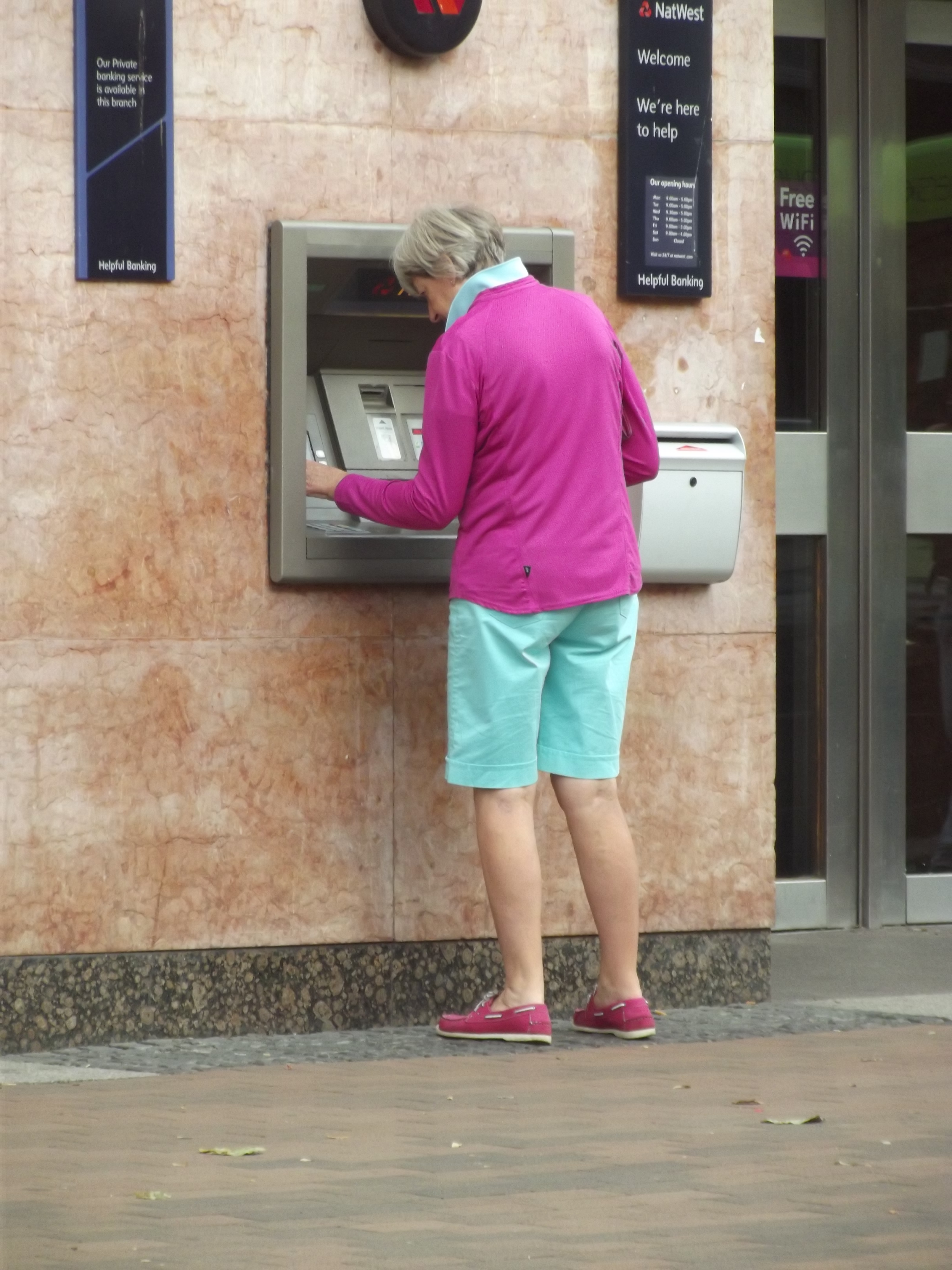 I saw this very smart lady in Taunton today; I couldn’t help but notice her bright pink jumper and matching shoes, and pale blue shorts and shirt. She was walking in front of us, striding along, then shot across the road and hurried along towards the County Stores. A few moments later she rushed back and stopped at the bank. I couldn’t resist taking a photo of her, I hope she doesn’t mind, but she looked so chic!