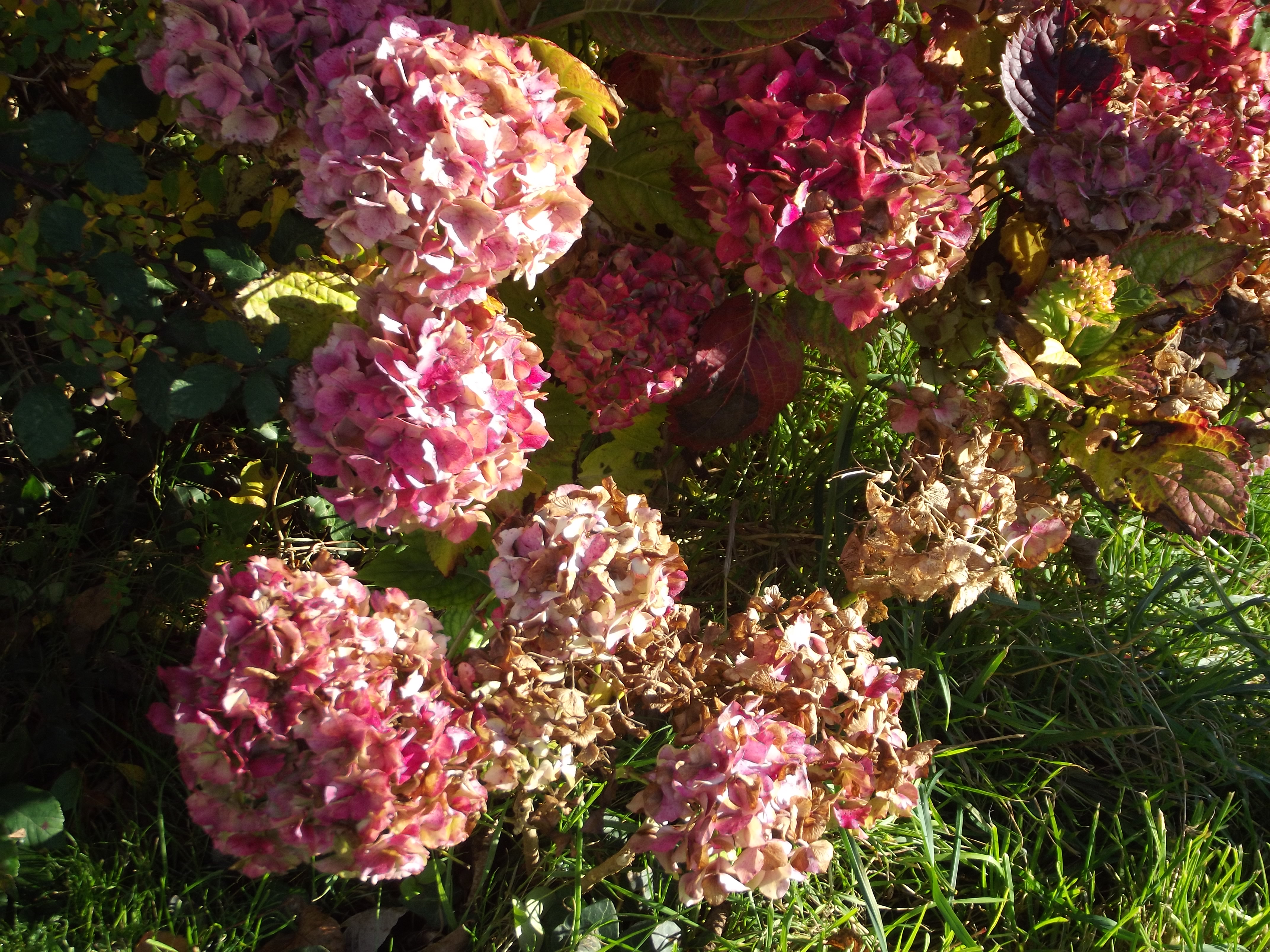 Hortensias or hydrangeas are wonderful and varied shrubs; they come in every shade from white to pink to red, or blue from the pales dawn blue to the deepest sunset mauves and purples. The flours stay on the plants, and turn beautiful paler shades and still look attractive; if you bring them indoors they dry out and can look really nice as an arrangement. As with may popular shrubs, they originate in Asia, mostly in China and Korea and also Japan. Some of them are deciduous but some of them are evergreen; there are shrubs, which stay small, and shrubs which grow up to three meters tall! There are also some climbing ones, which are very vigorous, as we learned, when we put one to grow along our back wall and it just went mad!! It didn’t however produce many flowers, which was the reason we bought it! Some varieties have large round ‘mop’ heads as ours does, but there are also some very pretty lace-caps… maybe we should get one next spring…