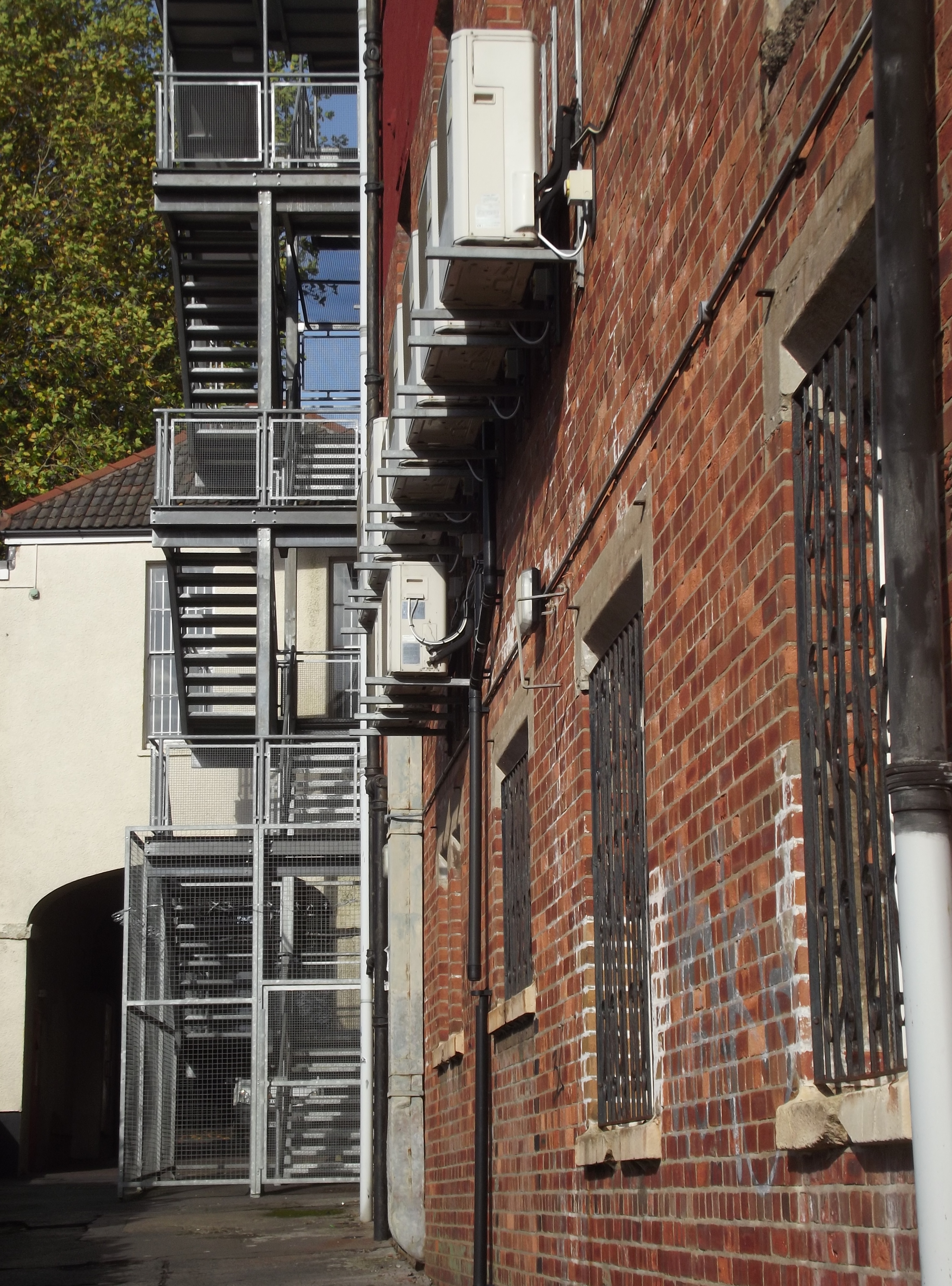 I saw this ugly metal fire-escape bolted onto the side of what might have been an elegant nineteenth century building except for the metal boxes bolted to the side which I guess are something to do with air conditioning or central heating or ducts for something or another… Oh and there are grills over the windows and graffiti…