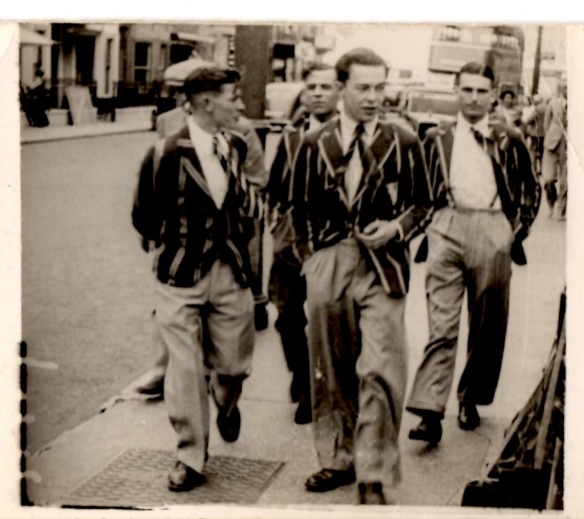 This photo is so of its time; the rowing club blazers, the baggy trousers held up by braces (I bet Donald had his held up with a tie – he couldn’t bear belts or braces!) and the brilliantined hair. This is my dad Donald, somewhere in Cambridge, no doubt near the river; he is on the left and beside him is his great friend Eric King who I always thought was so handsome! I don’t know the other two behind them, and I don’t know where they are going, maybe to a bump supper.
