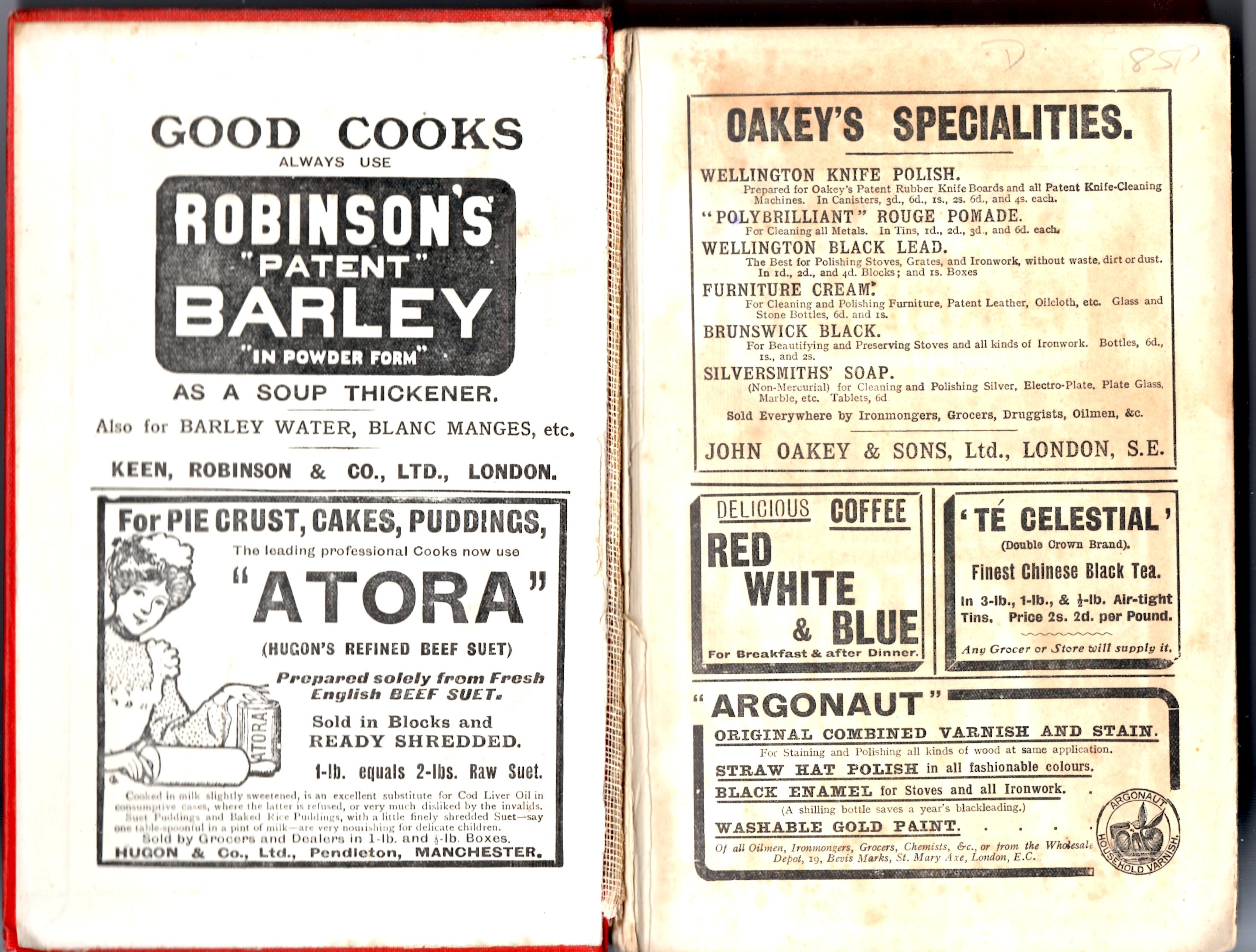 Another advert from Mrs Beeton, the 1912 edition, and if you went shopping today you could still buy Robinson’s barley products, squashes and drinks… and many other ‘new’ lines too! Atora still makes suet, and in fact I have a vegetarian ‘suet’ packet in my cupboard for when I make puddings… not that I do very often, but it’s there if I need it!