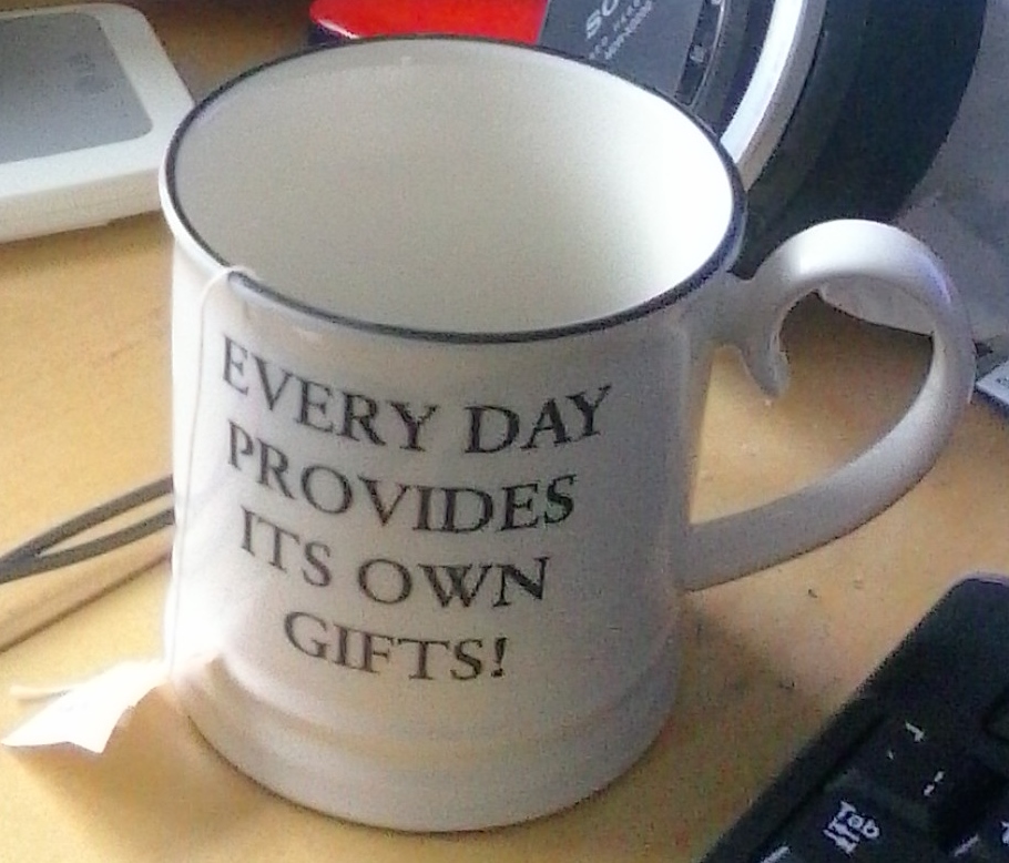 At the front, just by my hand, is one of my favourite mugs. it’s half full of Oolong tea (Sea Dyke brand from Xiamen) and I like it because it is nice to hold, it has a nice smooth, shiny glaze, it is an elegant and appealing shape and colour, and the truism is actually true and a useful reminder, ‘Every day provides its own gifts!’