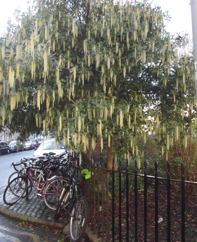 This small tree, or maybe a large bush,, was growing in a pretty square in Bristol; I took this picture the other day and you can tell by the dull light it’s winter. The tree was covered with leaves, small oval leaves, a pretty pale grey-green, reminding me a little of eucalyptus in colour, but the wrong shape… is eucalyptus an ever-green tree? I couldn’t properly see the bark, maybe I should have looked more closely but I think it was smooth, and pale too.