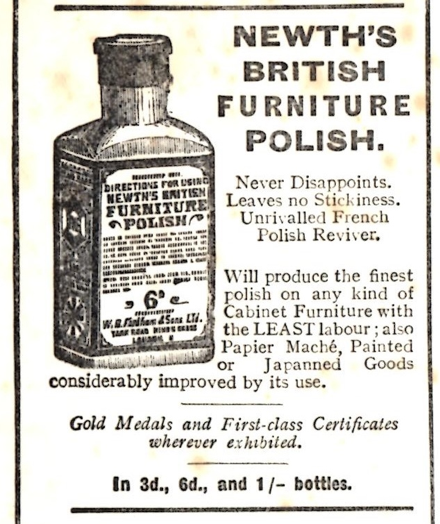 I have tried to find out more about Newth, who invented this British furniture polish – never disappoints, leaves no stickiness, unrivalled French polish reviver, this polish which can be used on any kind of Cabinet Furniture with the LEAST labour, also on Papier Maché, Painted or Japanned Goods which will be considerably improved by its use…