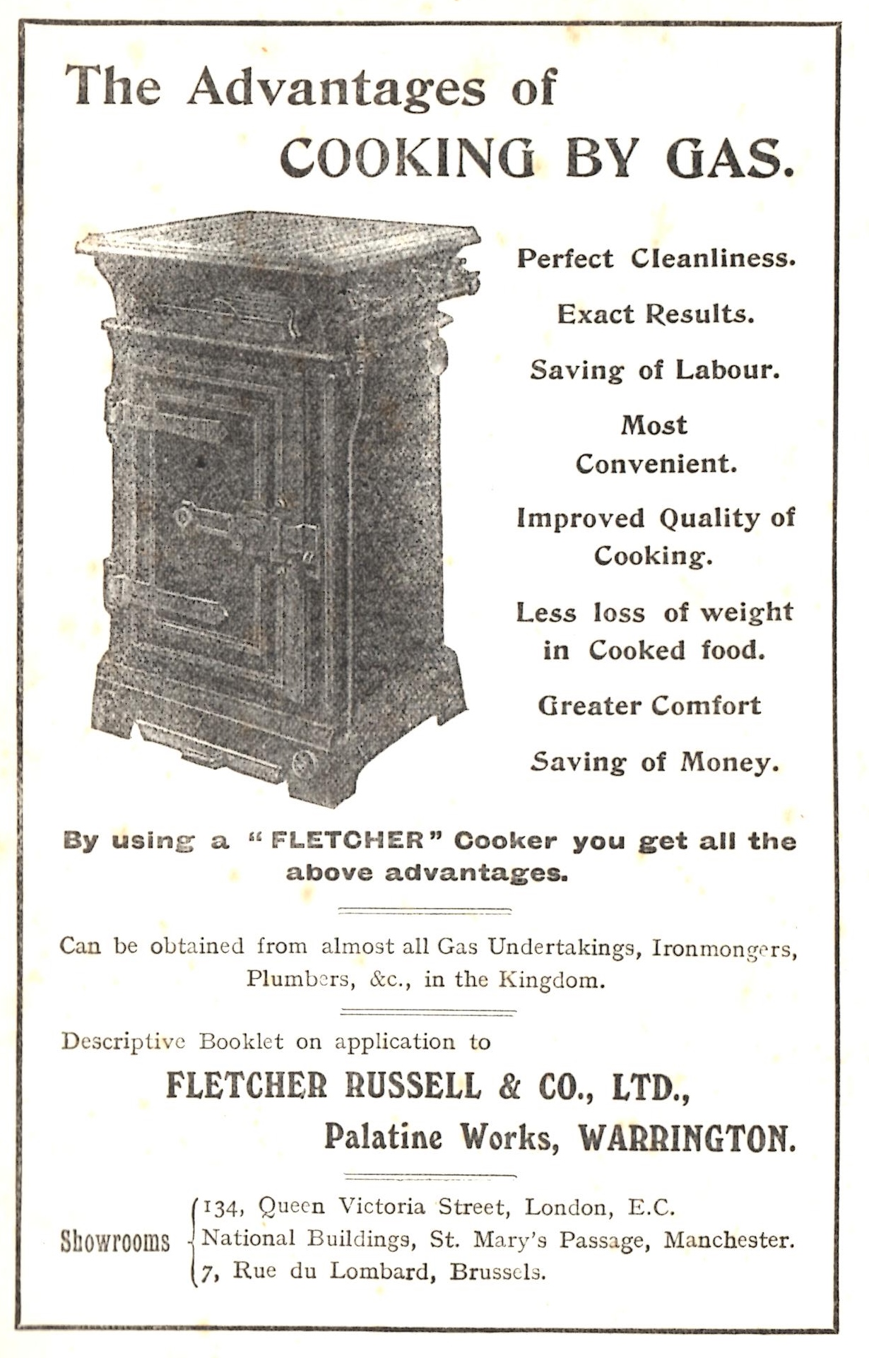 We have such hi-tech equipment in our kitchens with all sorts of new ways of cooking, microwaves, halogen hobs, sou-vide… but in 1912 you may have been delighted to have installed in your kitchen this fine appliance, a Fletcher Cooker. it offered everything that we still want, perfect cleanliness, exact results, saving of labour, most convenient, improved quality of cooking… and then something we may not have considered less loss of weight in cooked food, and greater comfort… not sure how you get greater comfort with a cooker, but the last great advantage is what everyone wants, saving of money!