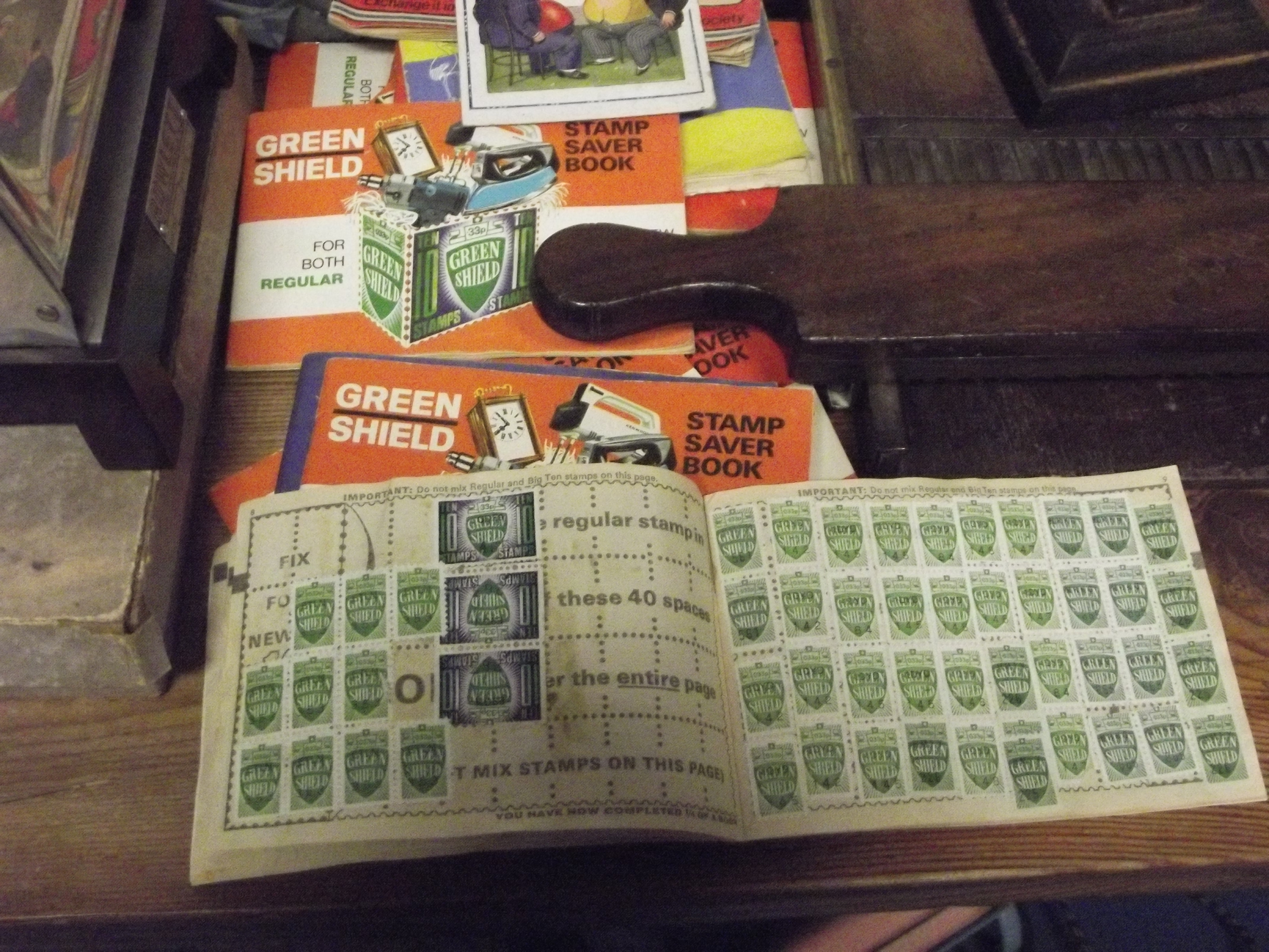 One item caught my eye… Green Shield Stamps. These days we have loyalty cards, and get points and bonuses and all sorts of different rewards for shopping in a particular store, or buying from a particular supplier, or using a specific service… way back in the olden days there were Green Shield Stamps. They were actual little stamps which you stuck in books as you can see from my photo, and when you had sufficient you could trade them for something. The scheme started in the USA in the 1950’s and soon spread to the UK. You received one stamp for every 6d (six pence in old money when there were twelve pence in a shilling and twenty shillings in a pound)