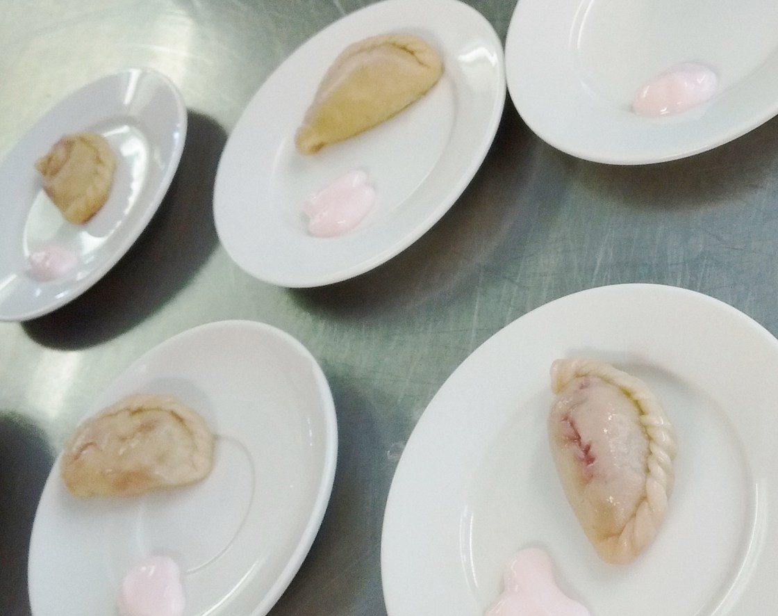 The process seems simple, but I’m sure it needs practice! Mix the ingredients to a dough, rest, knead, rest, roll out and cut small 3 inch circles to be filled with your choice of yum; gently poach in boiling water in a large pan. Once they start floating they are cooked. leave them to drain on an oiled tray, not touching because they are sticky. At this stage they can be frozen which seems a splendid plan to prepare in advance!