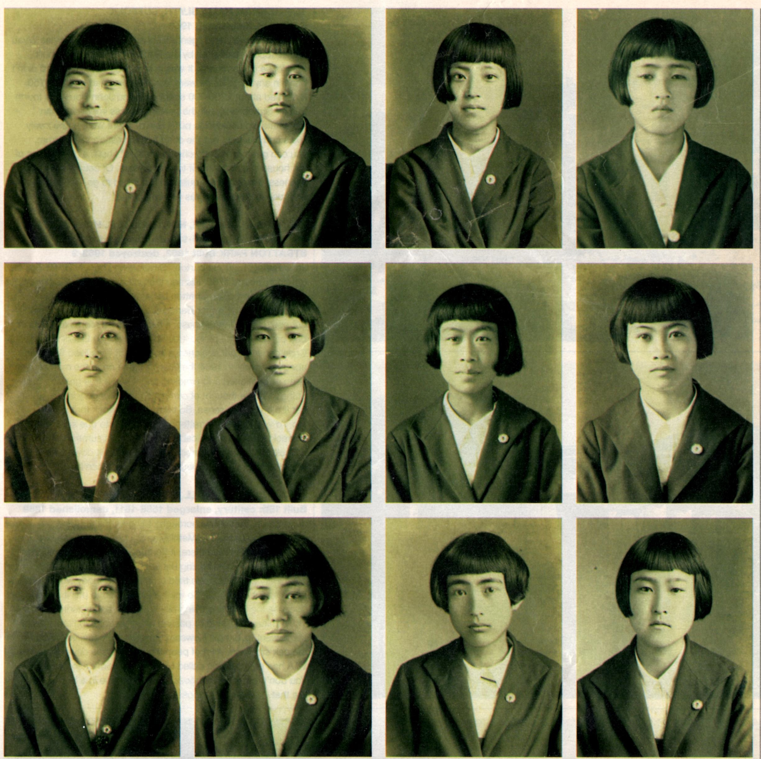 I’ve challenged myself to write about these twelve girls, classmates I think, at a state school, a private school, a boarding school? Are there any sisters, twins maybe?