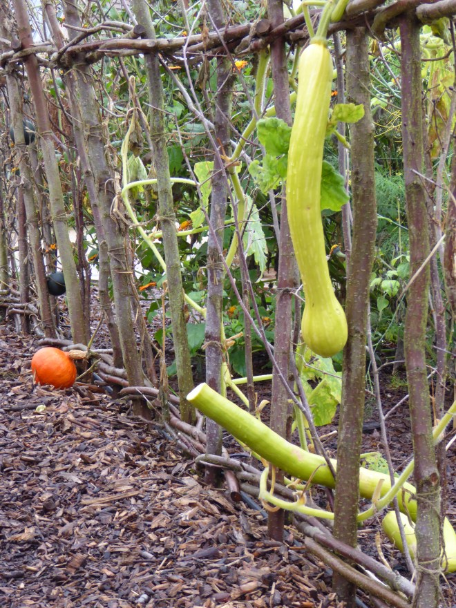 Looking round the rather lovely garden at Jordan’s Mill, we came across a tunnel structure to grow squashes and gourds; it was rather late in the season so not many remained on the vines, but it was an impressive and very sensible way to grow them.