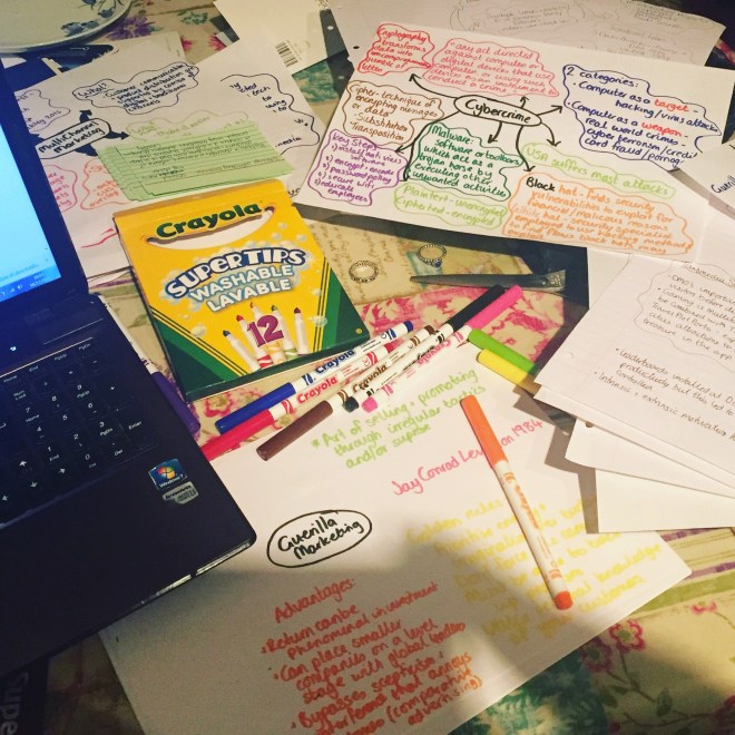 I’ve nearly always struggled academically, I was always a goody goody at school and did all the work but it just wouldn’t always sink in! One method I have continued to use since GCSE’s all those years ago are mindmaps with lots of colours!