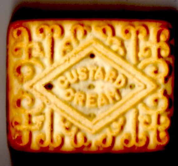 I thought custard creams must be an old traditional biscuit,with origins going back into the mists of culinary time; apparently they were first made in the early 1900’s, although the idea of sandwiching biscuits together with a filling is much older, and ‘printing’ patterns on biscuits, bread, pastry etc is even older. Almost every biscuit maker makes them, including supermarkets ‘own brands’, and apparently there are some which have different flavoured fillings such as chocolate – well, that doesn’t sound authentic to me!