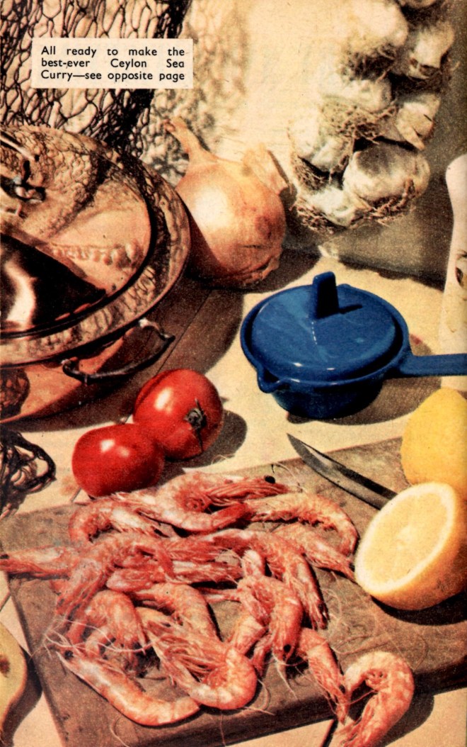 After the war, after years of rationing gradually foods came ‘off the ration’ and reappeared in shops and markets, and cooks started to bring colour and variety back to dishes… In the little cookery booklet from Spillers, the flour manufacturer, priced 1/- (1 shilling) and published in the late 50’s early 60’s, you can find local specialities such as Cornish saffron cake, Devonshire splits, Cumberland rum butter, and fidget pie which I wrote about yesterday, traditional favourites from the middle ages such as flummery and simnel cake, and dishes from other countries, Mexican custard, Portuguese sautéed chicken, and a Ceylon sea curry. These recipes may have been adapted for the taste of the time, and more because of the ingredients available, but it still shows that interest in different sort of food and flavours.