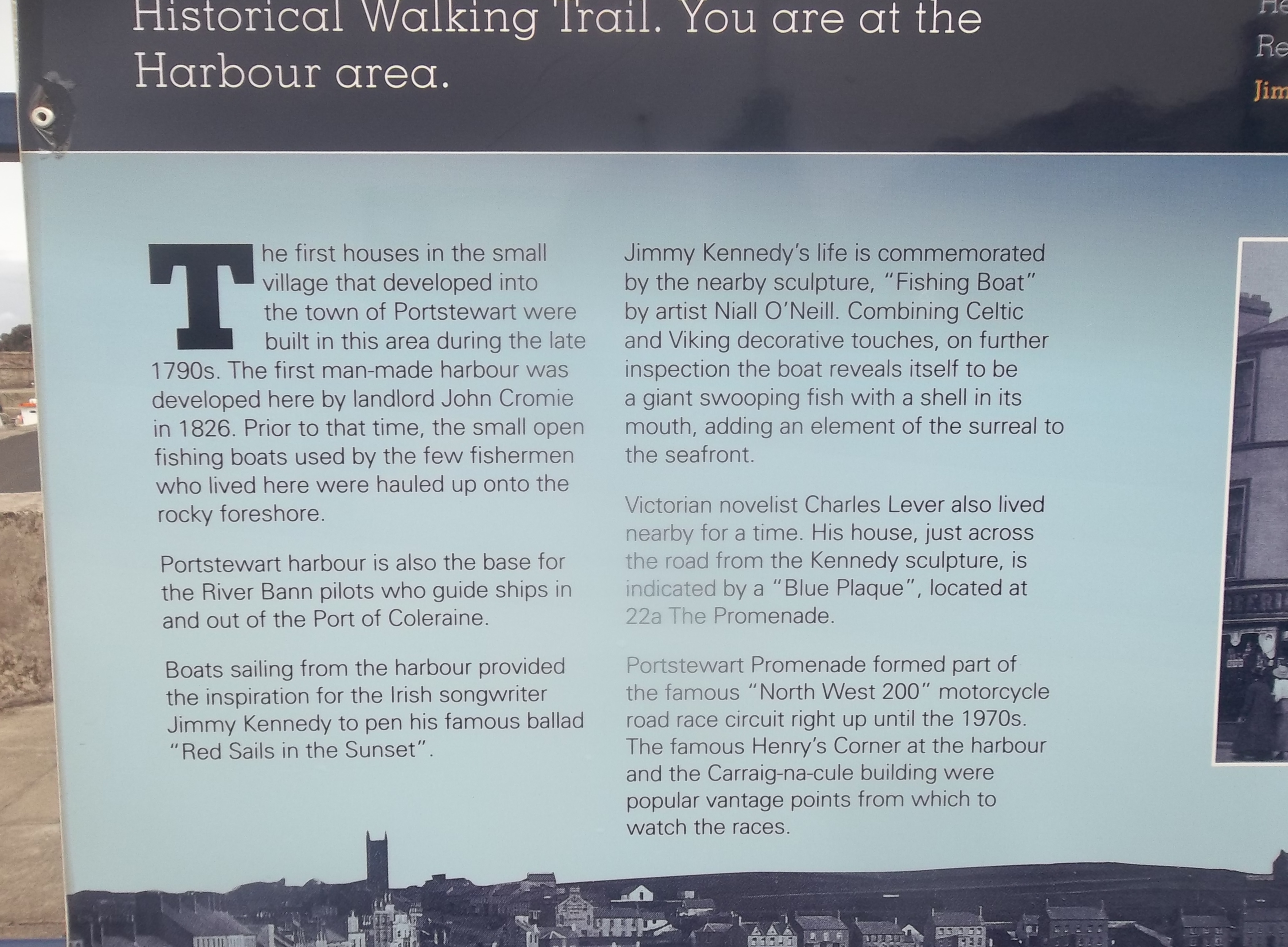 dscn2673Portstewart is a pretty little town with great shops, cafés, pubs and friendly people too. The beautiful sculpture commemorates Jimmy Kennedy who wrote ‘Red Sails in the Sunset’ and amazing number of other very popular and well-known songs. He wrote the lyrics of ‘The Teddy-bears’ Picnic’, ‘My Prayer’, ‘South of the Border’, ‘The Isle of Capri’, ‘Love is Like a Violin’, ‘The Hokey-Cokey’ and that song which seems to epitomise the 2nd World War, ‘We’re Going to Hang Out the Washing on the Siegfried Line’.