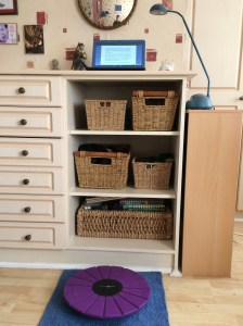 I bought a laptop, a very small one to use when we go on our travels… I can use it in the car, I can use it when we’re staying somewhere else… it will be really helpful (it’s no good me making written notes, I can’t read my own handwriting!) It suddenly occurred to me, that I could put my nice new little laptop on our tallboy in the bedroom and stand up to write! Perfect! I cleared everything aside, set up the laptop, and a lamp, plenty of room for papers, coffee/tea, stuff, and ready to go! Then I had a second inspiration. I have inherited from my daughter one of those circular wobble balance boards, the ones with a ball in the middle and a place for your feet – it looks a bit like a flying saucer… so instead of just standing, I stand on the balance board!